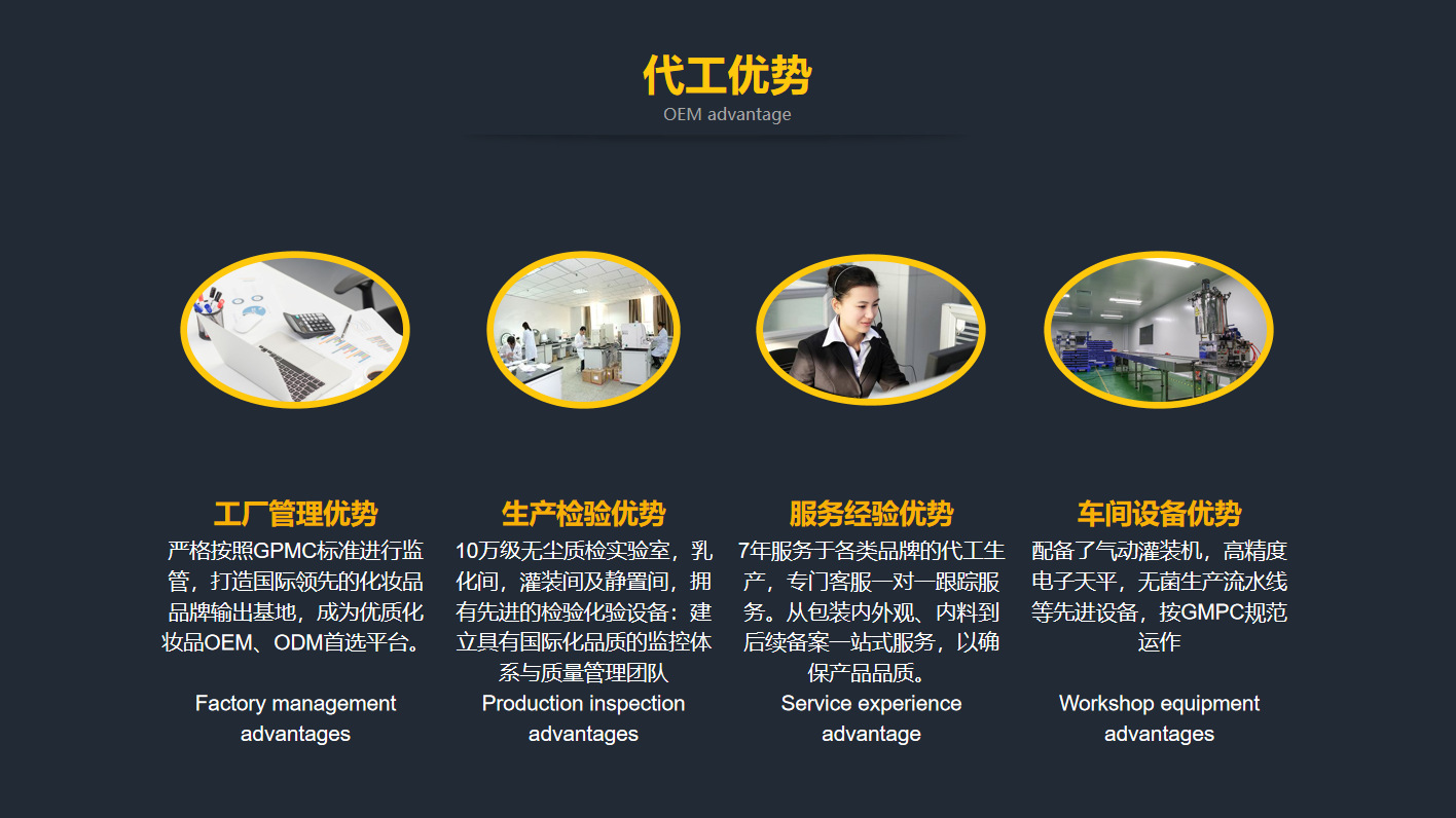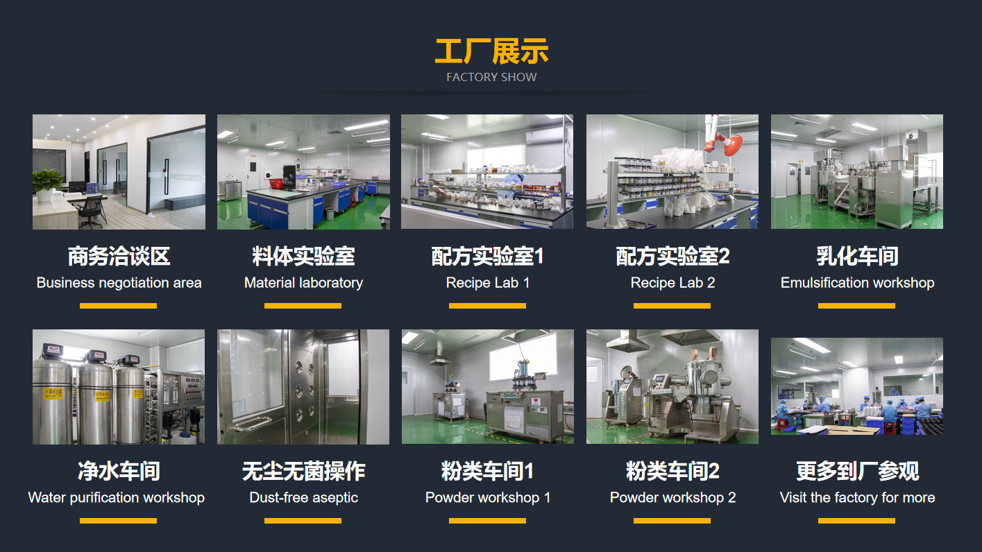 丹旎(廣州)生物科技有限公司,位于具有園林式生態環境的廣州市花都區鏡湖工業園內。占地面600多平方米,目前擁有員工200余名。工廠嚴格按照GMP生產標準建設;同時嚴格按照ISO9001管理體系規范產品品質,實施6S管理原則,高標準的生化研究室和檢驗室,確保技術優勢所需硬件要求,領先同行業競爭對手。 公司擁有一支強大的頂尖級技術研發團隊,是亞洲領先的化妝品品牌輸出生產基地。為國際多個化妝品品牌提供加工平臺,提供國際化妝品進出口業務資訊及項目合作業務,為客戶提供全方位的、個性化的專業生OEM/ODM/OBM服務;是集研發、生產、包裝配套、品牌推廣、市場營銷, 幫助客戶在日化線、專業線打造一個高品質、豐富品系的品牌,是國內化妝品行業知名生產代工企業,一度引領彩妝行業代工新風潮!