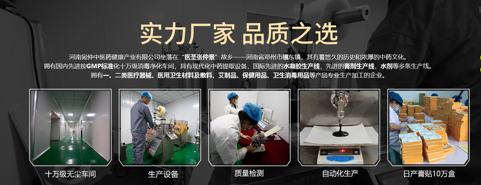 河南宛仲中醫藥健康產業有限公司坐落在“醫圣張仲景”故鄉——河南省鄧州市穰東鎮,其有著悠久的歷史和濃厚的中醫藥文化,醫圣巨作《傷寒論》就是在此走出國門,享譽世界,造福全人類。公司占地面積67多畝,擁有國內先進按GMP標準化十萬級消毒凈化車間,具有現代化中藥提取設備,國際先進的水凝膠生產線,先進的膏劑生產線,水劑生產線,掌握了傳承300多年傳統膏藥熬制工藝,與現代化中藥破壁生產技術,并建立了300多畝GMP中藥材種植基地,成立了現代化中醫中藥研發中心,并與國內及國際多家醫學院校、中醫藥研究院建立長久的戰略合作關系。