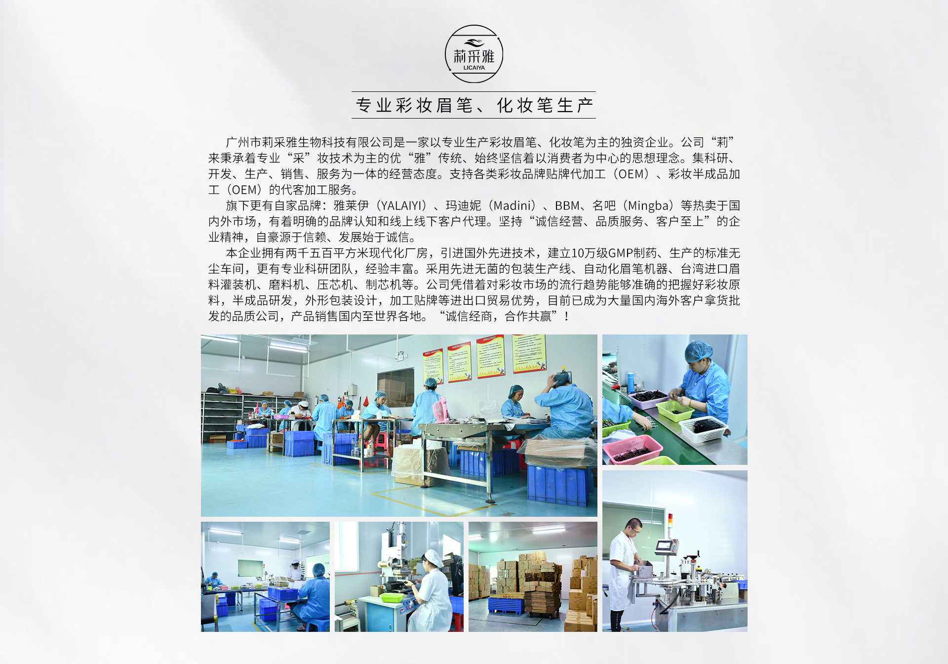 廣州市莉采雅生物科技有限公司是一家以專業(yè)生產(chǎn)彩妝眉筆、化妝筆為主的獨資企業(yè)。集科研、開發(fā)、生產(chǎn)、銷售、服務(wù)為一體的經(jīng)營態(tài)度。支持各類彩妝品牌貼牌代加工(OEM)、彩妝半成品加工(OEM)的待客服務(wù)。旗下更有自家品牌:雅萊伊(YALAIYI)、瑪?shù)夏荩∕adini)、BBM、名吧(Mingba)等熱賣于國內(nèi)外市場,本企業(yè)擁有兩千五百平方米現(xiàn)代化廠房,引進(jìn)國外先進(jìn)技術(shù),建立10萬級GMP制藥、生產(chǎn)的標(biāo)準(zhǔn)無塵車間,更有專業(yè)科研團(tuán)隊,經(jīng)驗豐富。采用先進(jìn)無菌的包裝生產(chǎn)線、自動化眉筆機(jī)器、臺灣進(jìn)口眉料灌裝機(jī)、磨料機(jī)、壓芯機(jī)、制芯機(jī)等。公司憑借著對彩妝市場的流行趨勢能夠準(zhǔn)確的把握好彩妝原料,半成品研發(fā),包裝等;歡迎大家前來合作
