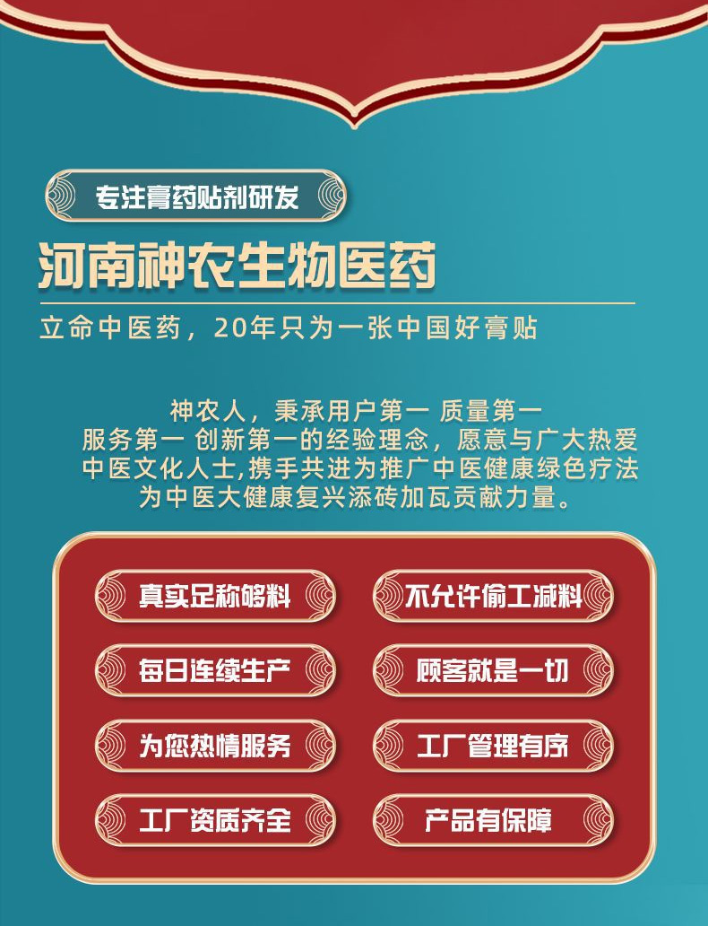 河南神農(nóng)生物醫(yī)藥科技有限公司位于河南省歷史文化名城濟(jì)源市,廠房面積12000平;是一家集生產(chǎn)、研發(fā)、銷(xiāo)售、培訓(xùn)為一體的現(xiàn)代化高新中醫(yī)藥產(chǎn)業(yè)鏈產(chǎn)品供應(yīng)商企業(yè);公司始終以繼承和發(fā)揚(yáng)中醫(yī)文化和中醫(yī)藥產(chǎn)業(yè)發(fā)展為己任,致力于中醫(yī)外敷、外治、外用及內(nèi)服調(diào)理產(chǎn)品的研究和生產(chǎn),目前公司已建立有膏劑代加工、消毒產(chǎn)品代加工、食療(粉劑、膏滋)產(chǎn)品代加工、化妝品代加工4個(gè)專(zhuān)業(yè)生產(chǎn)線車(chē)間,涵蓋了包括:醫(yī)療器械、兒童穴位貼敷系列、風(fēng)濕疼痛系列、女性健康系列、男性健康系列、足貼足浴粉系列、退熱貼、鼻炎貼、失眠貼、眼貼、咽炎貼等多個(gè)類(lèi)別的中醫(yī)外用制劑和食療系列的產(chǎn)品,此外,公司具備有完善的生產(chǎn)資質(zhì),擁有正規(guī)的一類(lèi)、二類(lèi)醫(yī)療器械批號(hào)、保健品批號(hào),并且配備有一支專(zhuān)業(yè)的醫(yī)藥行業(yè)品牌營(yíng)銷(xiāo)策劃團(tuán)隊(duì),可以為微商、電商、抖商、醫(yī)藥連鎖、美容院、推拿店、兒推館等商家提供專(zhuān)業(yè)的OEM。