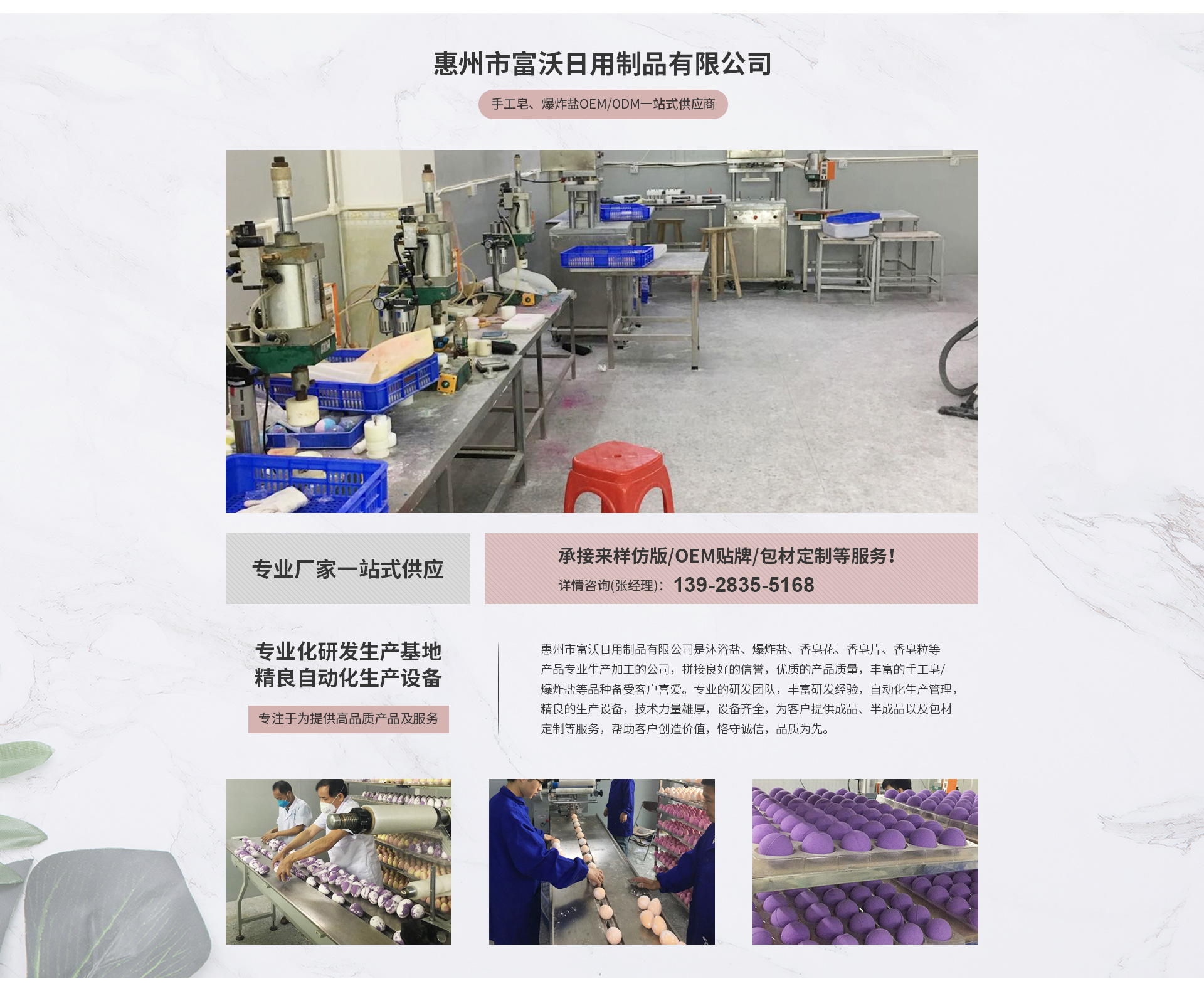 惠州市富沃日用制品有限公司是沐浴鹽、爆炸鹽、香皂花、香皂片、香皂粒等產品專業生產加工的公司,擁有完整、科學的質量管理體系。惠州市富沃日用制品有限公司的誠信、實力和產品質量獲得業界的認可。歡迎各界朋友蒞臨參觀、指導和業務洽談。