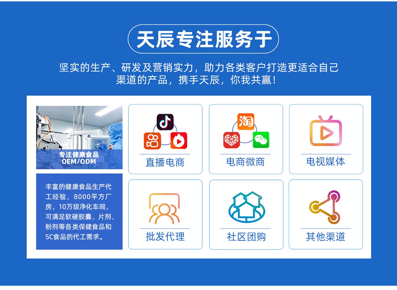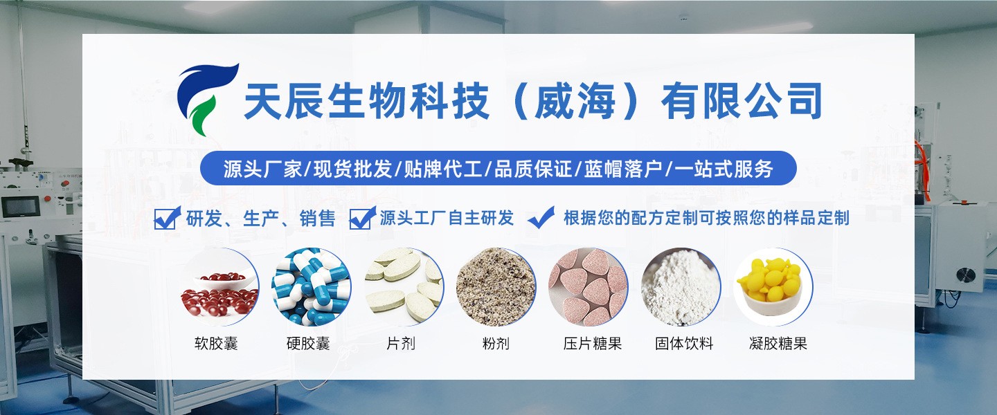 天辰生物科技(威海)有限公司,成立于2020年,是一家集研發(fā)、設(shè)計(jì)、生產(chǎn)、銷售為一體的高新技術(shù)企業(yè)。 注冊(cè)資金2000萬(wàn)元,坐落于山東省威海市醫(yī)療器械產(chǎn)業(yè)園。公司自成立以來,始終堅(jiān)持以人才為本、誠(chéng)信立業(yè)的經(jīng)營(yíng)原則,公司現(xiàn)員工約60余人。工廠面積約8000多平方米,其中600余平米的研發(fā)實(shí)驗(yàn)室,5000余平米的10萬(wàn)級(jí)凈化車間。同時(shí)擁有軟膠囊、膠囊、片劑、粉劑、固體飲料、壓片糖果、凝膠糖果、特殊膳食食品等多條現(xiàn)代化生產(chǎn)線,軟膠囊年產(chǎn)能高達(dá)25億粒。公司目前已通過榮獲HACCP,ISO9001出口資質(zhì)認(rèn)證,并承接各類特殊膳食食品、 SC營(yíng)養(yǎng)食品代加工、私人定制、保健食品OEM、委托加工、出口加工等業(yè)務(wù)。