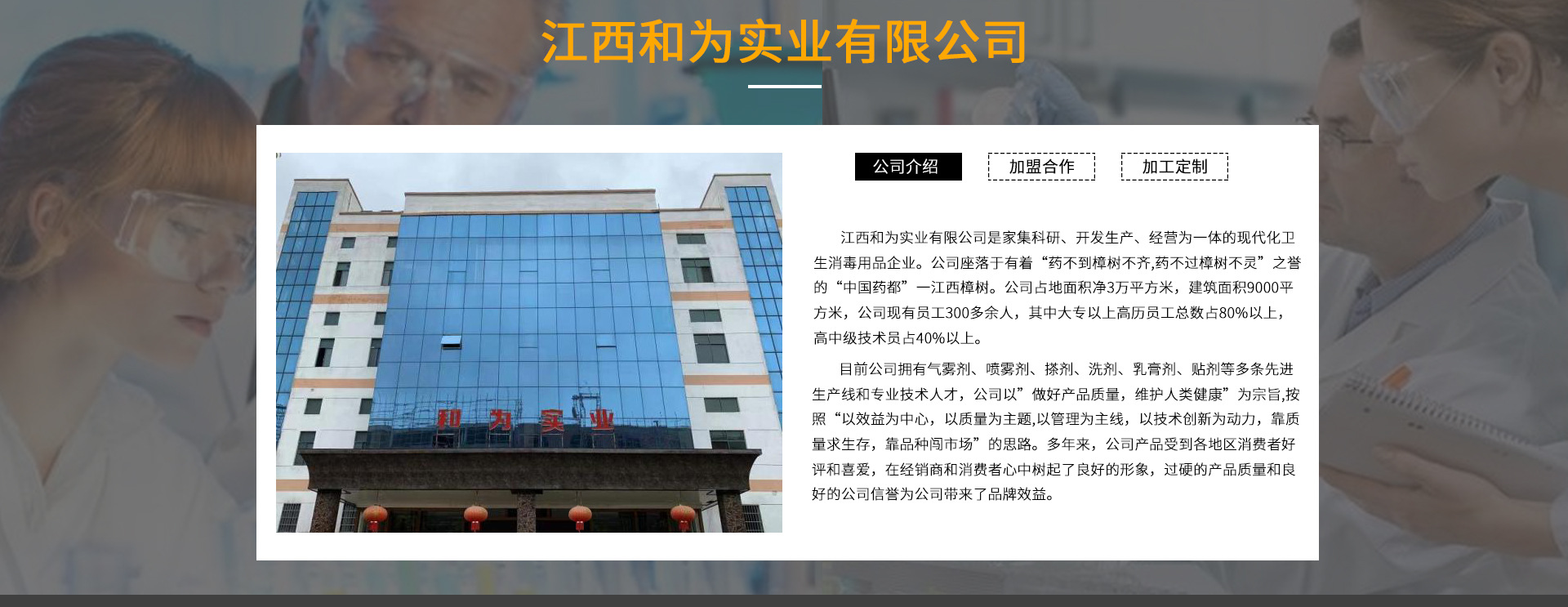 江西和為實業有限公司是一家集科研、開發、生產、經營為一體的現代化衛生消毒用品企業。公司座落于有著“藥不到樟樹不齊,藥不過樟樹不靈”之譽的“中國藥都”——江西樟樹。公司占地面積凈3萬平方米,建筑面積9000平方米,公司現有員工300多余人,其中大專以上高歷員工總數占80%以上,高中級技術員占40%以上,全員培訓合格率達100%。我們將以“團結守信、求真務實、開拓進取、傳承創新”的企業精神,積極同各界朋友及經銷商交流合作,共同創建一種平等、互惠、共贏的戰略伙伴關系,為人類健康事業的發展作出應有的貢獻,回饋社會各界對我們的支持與厚愛。我們期待您的關注,期待與您共贏未來。