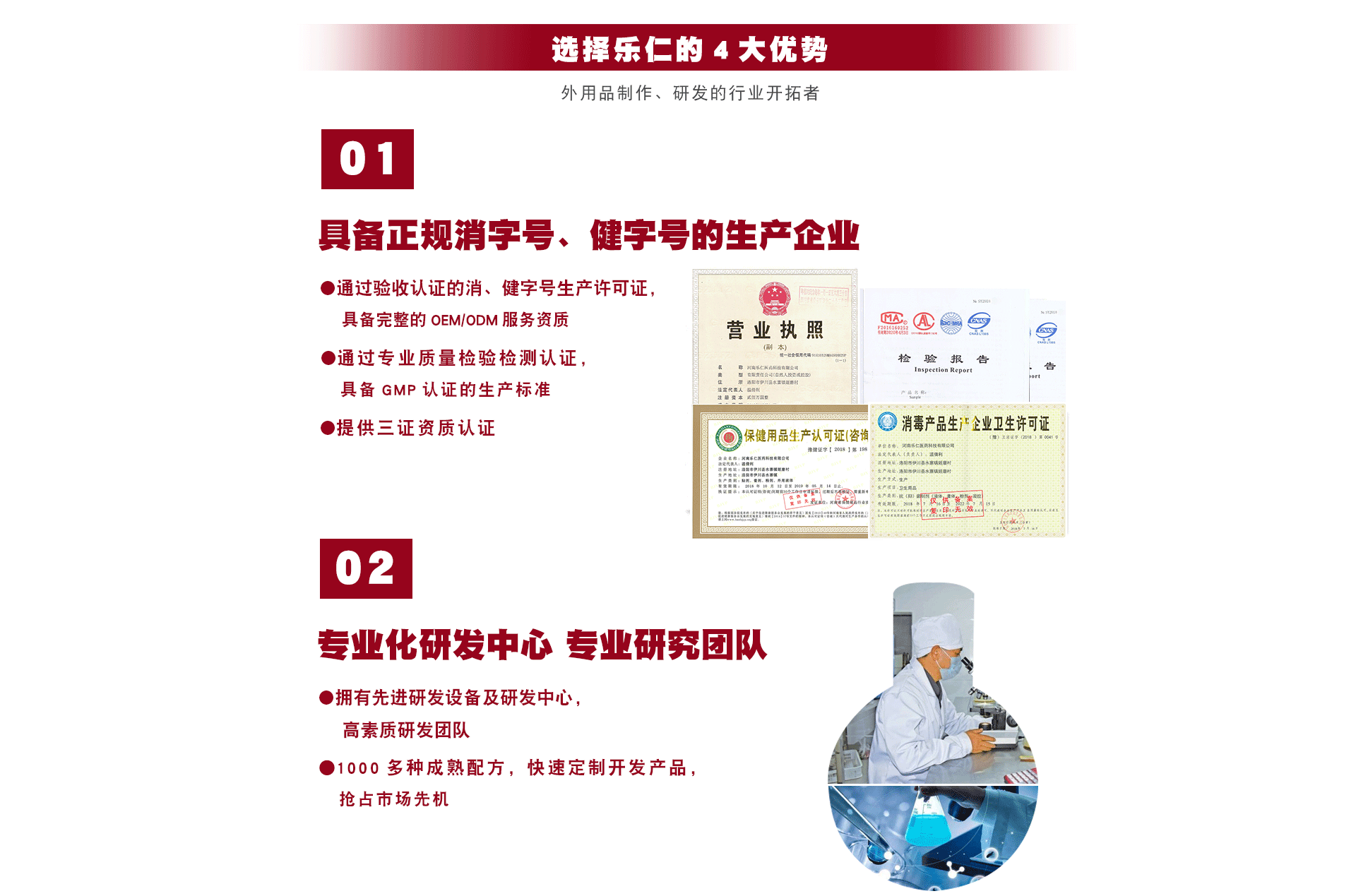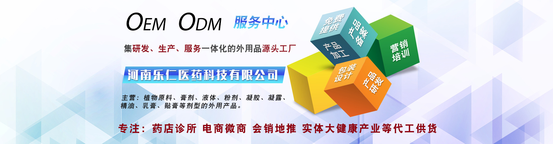河南樂仁醫(yī)藥科技有限公司是一家集研發(fā)、生產(chǎn)、銷售貼牌OEM代加工的功效型健字號(hào)和功效型消字號(hào)產(chǎn)品生產(chǎn)企業(yè)。工廠座落于古都洛陽,擁有GMP認(rèn)證的十萬級(jí)凈化無菌車間,主要生產(chǎn)膏劑、液體、粉劑、凝膠、凝露、精油、乳膏、貼膏等劑型的外用產(chǎn)品。