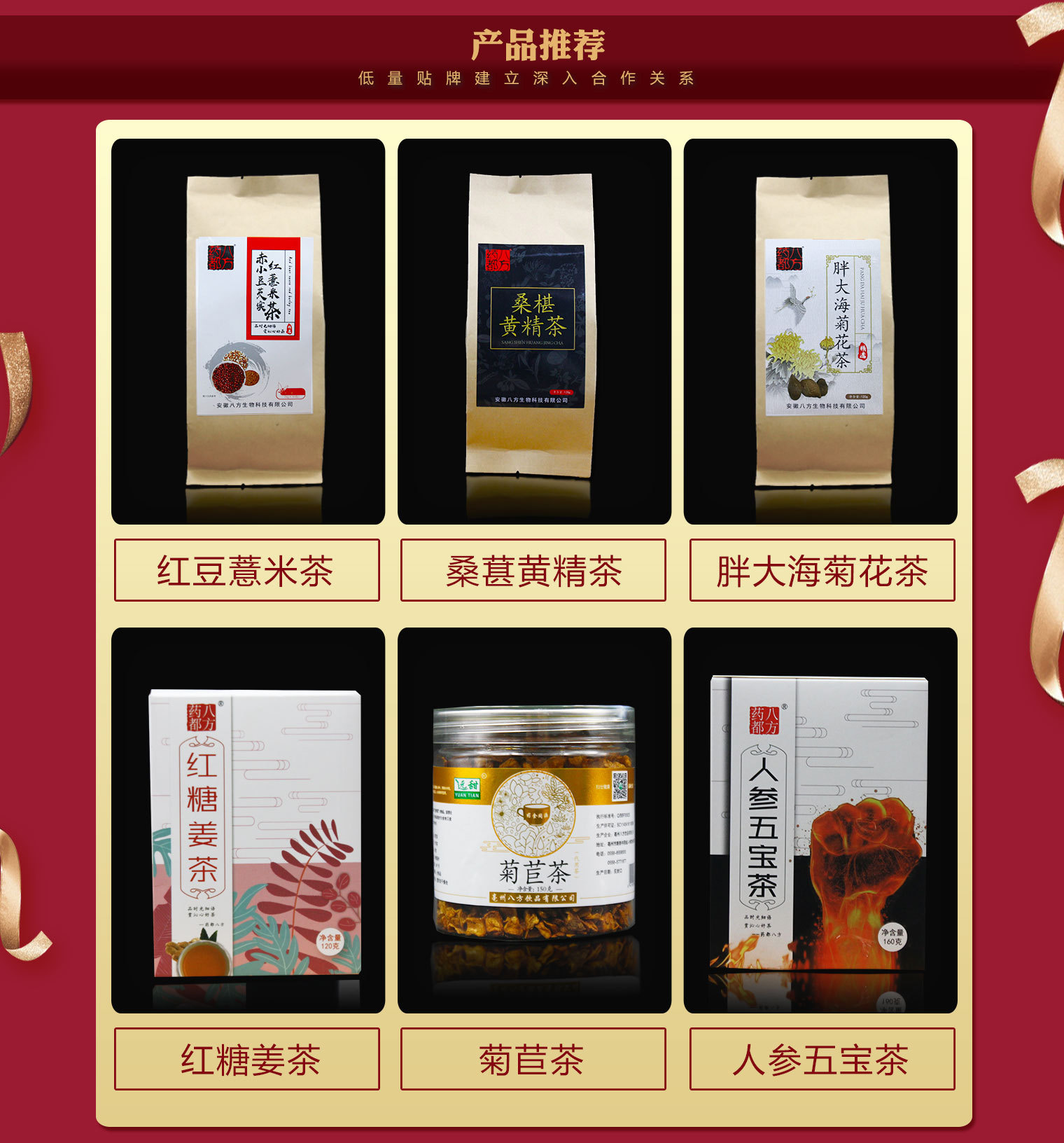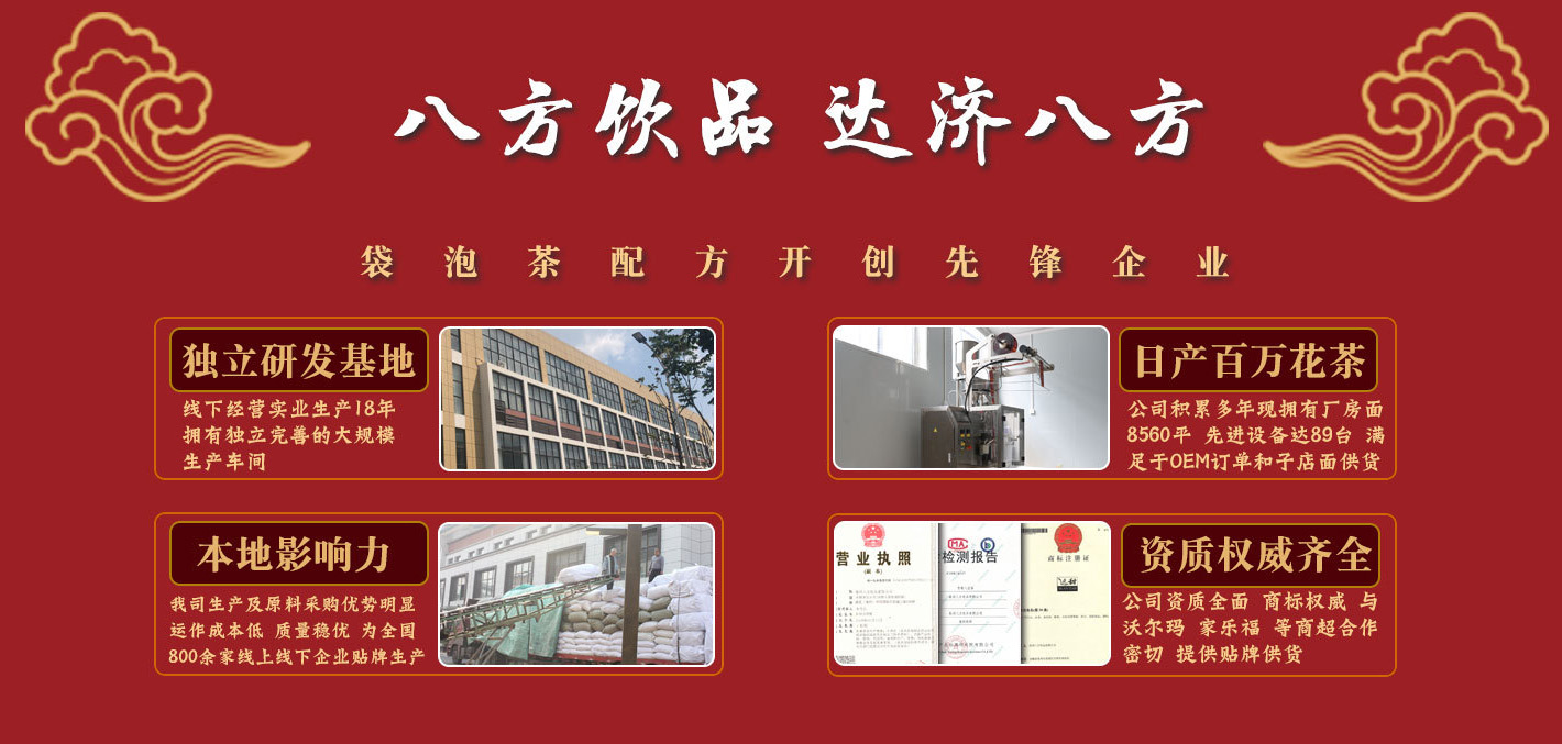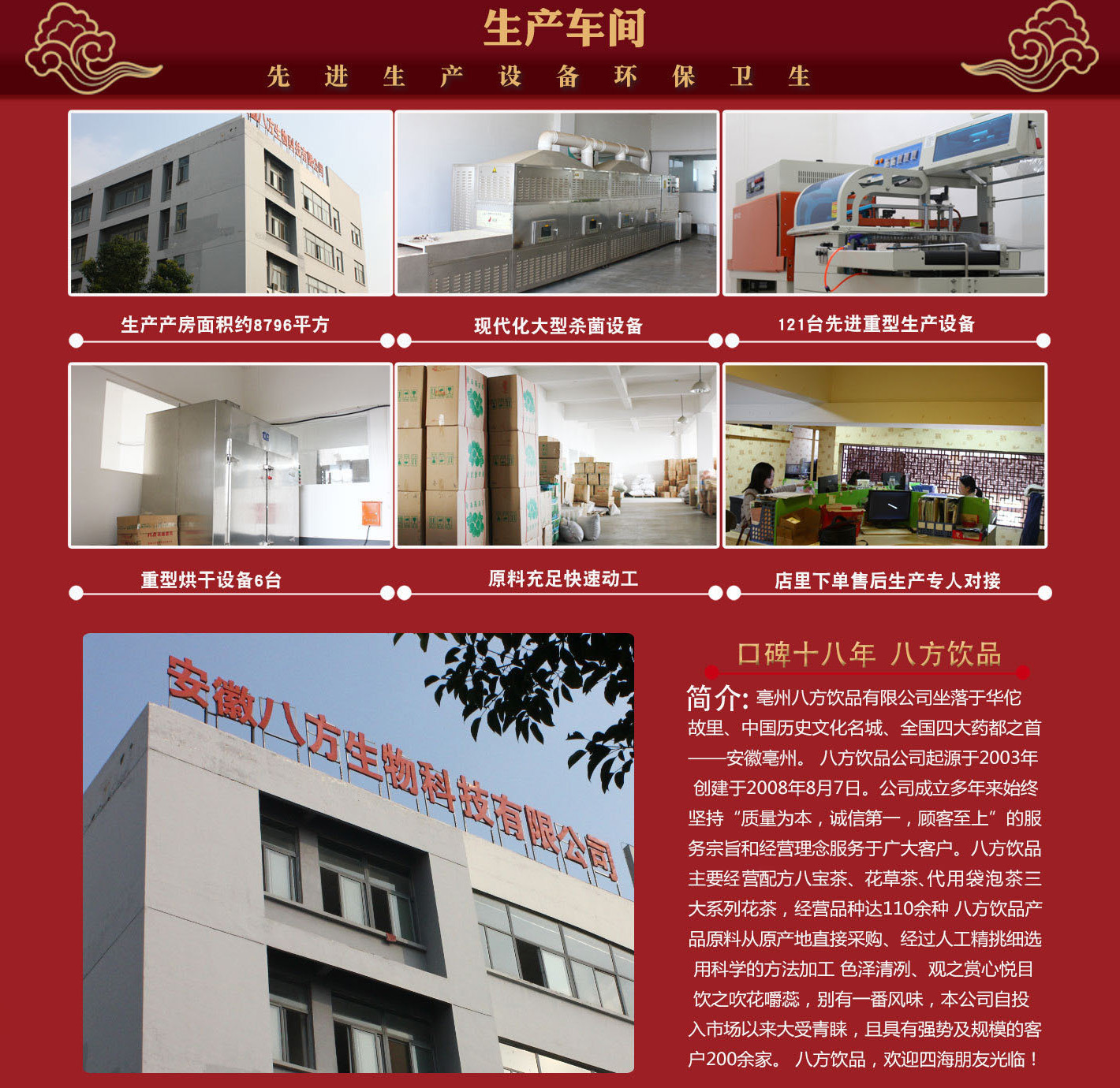 亳州八方飲品有限公司坐落于華佗故里、中國歷史文化名城、全國四大藥都之首——安徽亳州。 八方飲品公司起源于2003年 ,創建于2008年8月7日。公司成立7年來始終堅持“質量為本,誠信第一,顧客至上”的服務宗旨和經營理念服務于廣大客戶。八方飲品主要經營養生八寶茶、花草茶、養生滋補茶三大系列花茶,經營品種達110余種。 八方飲品產品原料從原產地直接采購、經過人工精挑細選、用科學的方法加工而成。