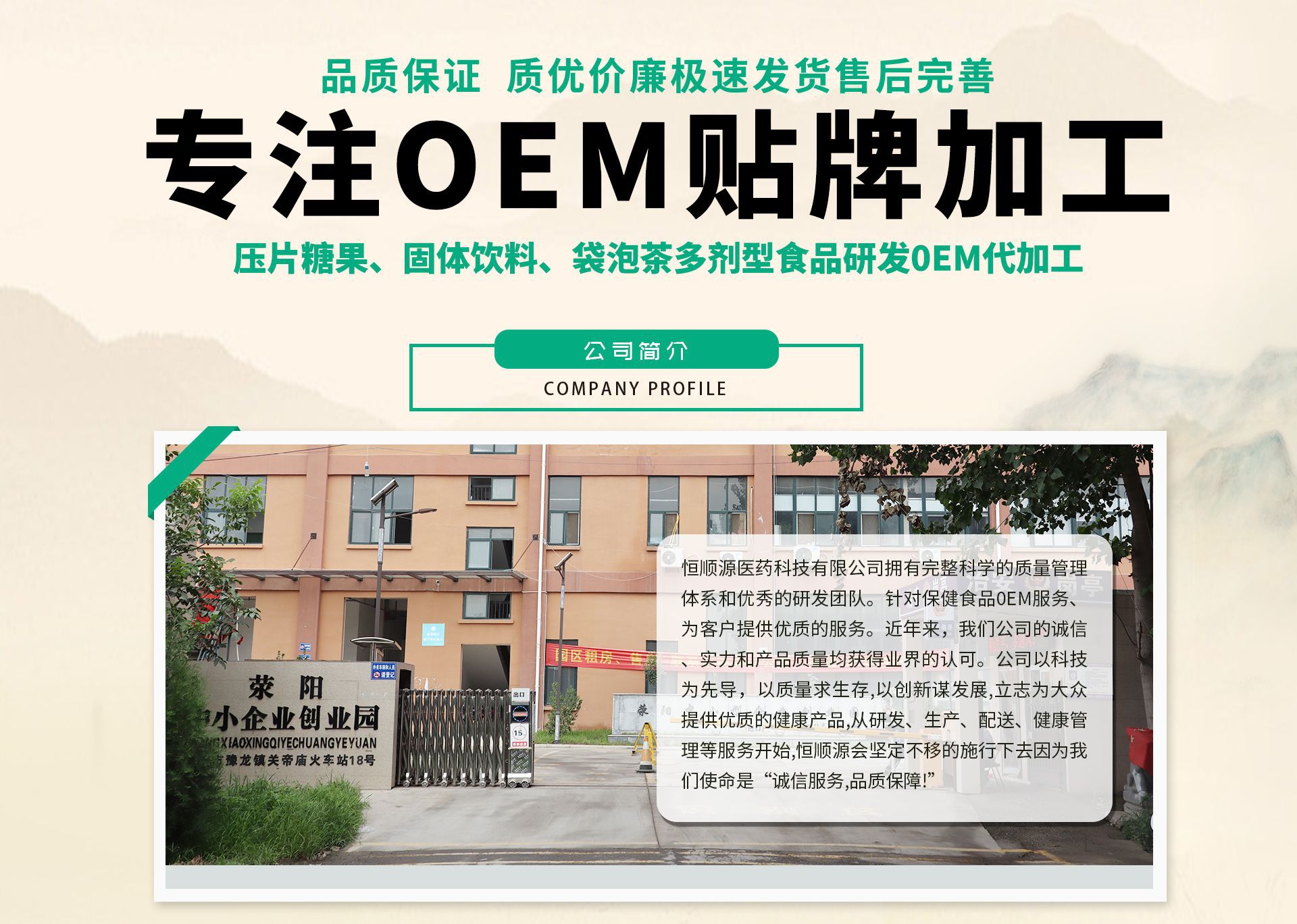 河南恒順源醫藥科技有限公司,是一家綜合性健康生物制品企業,主營健康食品,SC營養食品OEM、ODM、招商等業務。是一家專業從事高新生物技術研究和健康營養品開發的研發型企業,由國內名牌大學生命科學園多位專家教授、博士等人員主導研發,擁有適于不同年齡結構人群的健康營養品組方。在國內享有其技術和營養品組方使用權;產品原料主要根據國家頒布的《新資源食品目錄》和《藥食同源目錄》,原料產地也經過嚴格把關;產品做到有方可依、有據可查。目前公司產品劑型涵蓋壓片糖果、片劑、沖劑和固體飲料等多種劑型的生產流水線。并建立了全新現代規范化十萬級凈化車間,引進一系列先進生產設備,制粒混合設備、干燥設備、高速壓片機、激光噴碼機以及全自動灌裝線等多種劑型的生產流水全新的現代化規范化生產廠區、裝備多臺生產設備以及成立專項實驗室,配備先進實驗設備,引進國內大學的相關專業人員組建技術團隊。