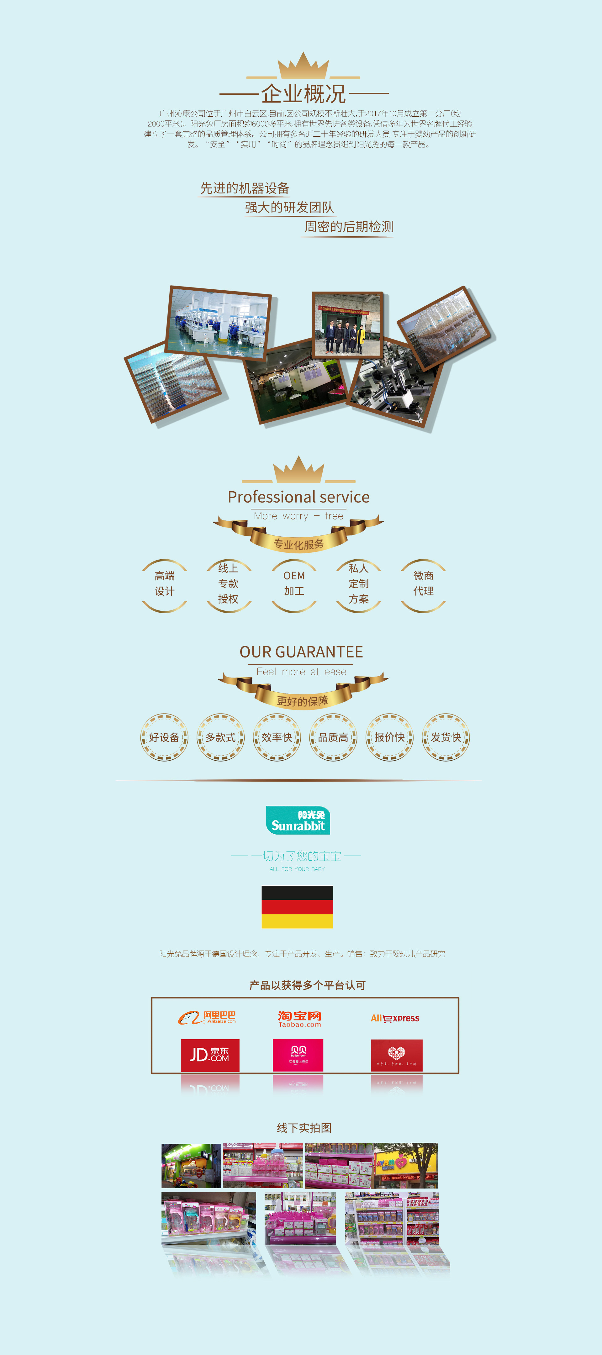 廣州沁康嬰童用品有限公司成立于2013年,注冊(cè)資金100萬(wàn)元,是一家集研發(fā)、生產(chǎn)、銷售、服務(wù)于一體的公司,從事母嬰行業(yè)七年來(lái),公司已邁進(jìn)一個(gè)新階段,并不斷擴(kuò)大經(jīng)營(yíng)規(guī)模。已經(jīng)發(fā)展成為擁有兩大自主品牌、一個(gè)電商事業(yè)部、一個(gè)OEM事業(yè)部的企業(yè)。公司著眼未來(lái),與一線商超、母嬰連鎖店、分銷商合作。目前,線下合作的母嬰門店超過(guò)10000家,線上領(lǐng)域,與阿里巴巴、淘寶、海拍客、拼多多深入合作。廣州沁康子公司“陽(yáng)光兔(廣州)科技有限公司”獲得阿里巴巴“2019年度最佳新秀獎(jiǎng)”。公司多個(gè)店鋪成為拼多多2019年度核心KA商家,公司逐步完善線上與線下同步發(fā)展的步伐。 公司秉承以安全、研發(fā)技術(shù)領(lǐng)先的企業(yè)發(fā)展理念, 以“為寶寶提供安全的產(chǎn)品及服務(wù),為家庭創(chuàng)造更優(yōu)質(zhì)的生活”為自身使命,以安全優(yōu)質(zhì)的產(chǎn)品為基礎(chǔ),以強(qiáng)大的研發(fā)團(tuán)隊(duì)為依托,以全面的服務(wù)為引導(dǎo)