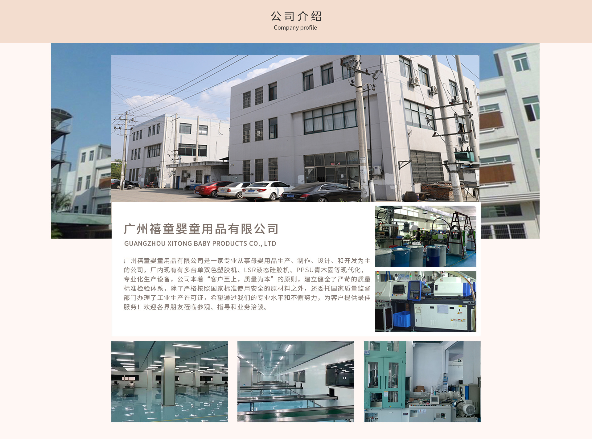 廣州禧童嬰童用品有限公司是一家專業從事母嬰用品生產、制作、設計、和開發為主的公司,廠內現有有多臺單雙色塑膠機、LSR液態硅膠機、PPSU青木固等現代化,專業化生產設備,公司本著“客戶至上,質量為本”的原則,建立健全了嚴苛的質量標準檢驗體系,除了嚴格按照國家標準使用安全的原材料之外,還委托國家質量監督部門辦理了工業生產許可證,希望通過我們的專業水平和不懈努力,為客戶提供最佳服務!歡迎各界朋友蒞臨參觀、指導和業務洽談。