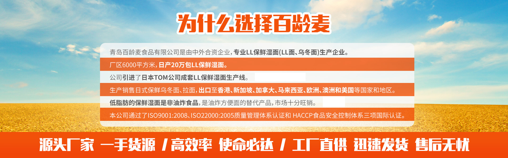 青島百齡麥食品有限公司是新加坡百齡麥集團公司下屬企業,由中外合資企業青島星華糧油食品有限公司與香港廣泰代理有限公司合資興建的專業LL保鮮濕面(LL面、烏冬面)生產企業。公司成立于2003年6月,2003年12月正式試生產,注冊資本為121萬美元,投資總額近3000萬人民幣。廠區6000平方米,日產20萬包LL保鮮濕面。 公司引進了日本TOM公司成套LL保鮮濕面生產線,生產銷售日式保鮮烏冬面、拉面,出口至香港、新加坡、加拿大、馬來西亞、歐洲、澳洲和美國等國家和地區。低脂肪、非油炸的保鮮濕面是油炸方便面的替代產品,市場十分旺銷。 本公司擁有自主出口權,產品獲得美國FDA認證。通過了ISO9001:2008、ISO22000:2005質量管理體系認證、 HACCP食品安全控制體系、BRC國際認證四項國際認證。產品質量放心可靠