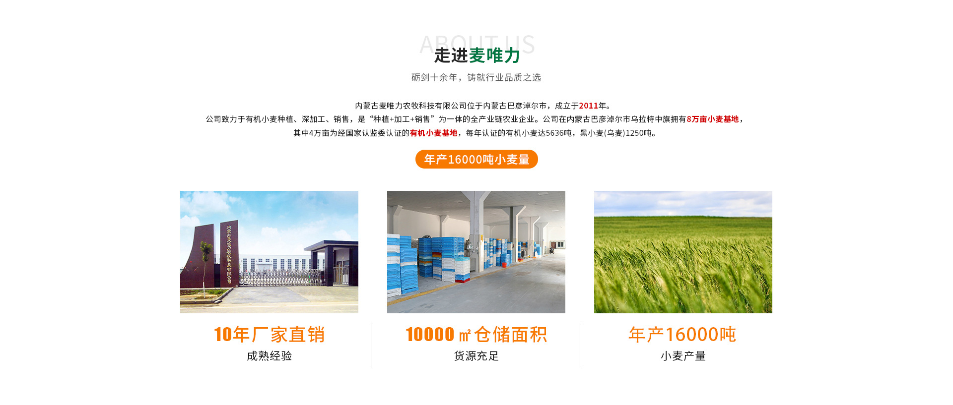 內蒙古麥唯力農牧科技有限公司成立于2011年,位于內蒙古巴彥淖爾市。公司致力于有機小麥種植、精深加工、銷售及有機產品開發,以 “種植+加工+銷售”為一體的全產業鏈農業企業。公司在內蒙古巴彥淖爾市烏拉特中旗擁有8萬畝小麥基地,年產小麥16000噸,其中8萬畝為經國家認監委認證的有機小麥基地,每年認證的有機小麥達5000噸,是內蒙古河套地區最大的有機小麥種植基地。 同時,公司利用小麥基地周邊得天獨厚的自然條件,在烏拉特中旗天然草場飼養了無公害自然放養的草坡羊,并向國家認監委申請認證了30000只有機羊。 并且,公司還整合了巴彥淖爾優質雜糧及健康食用油等產品,將巴彥淖爾健康、綠色、營養價值極高的農產品推向千家萬戶。