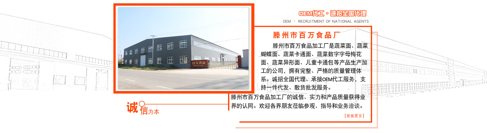 滕州市百萬食品加工廠是蔬菜面、蔬菜蝴蝶面、蔬菜卡通面、蔬菜數字字母梅花面、蔬菜異形面、兒童卡通包 兒童餅干 兒童零食 寶寶零食 等產品專業生產加工的公司,擁有完整、科學的質量管理體系。滕州市百萬食品加工廠的誠信、實力和產品質量獲得業界的認可。歡迎各界朋友蒞臨參觀、指導和業務洽談。