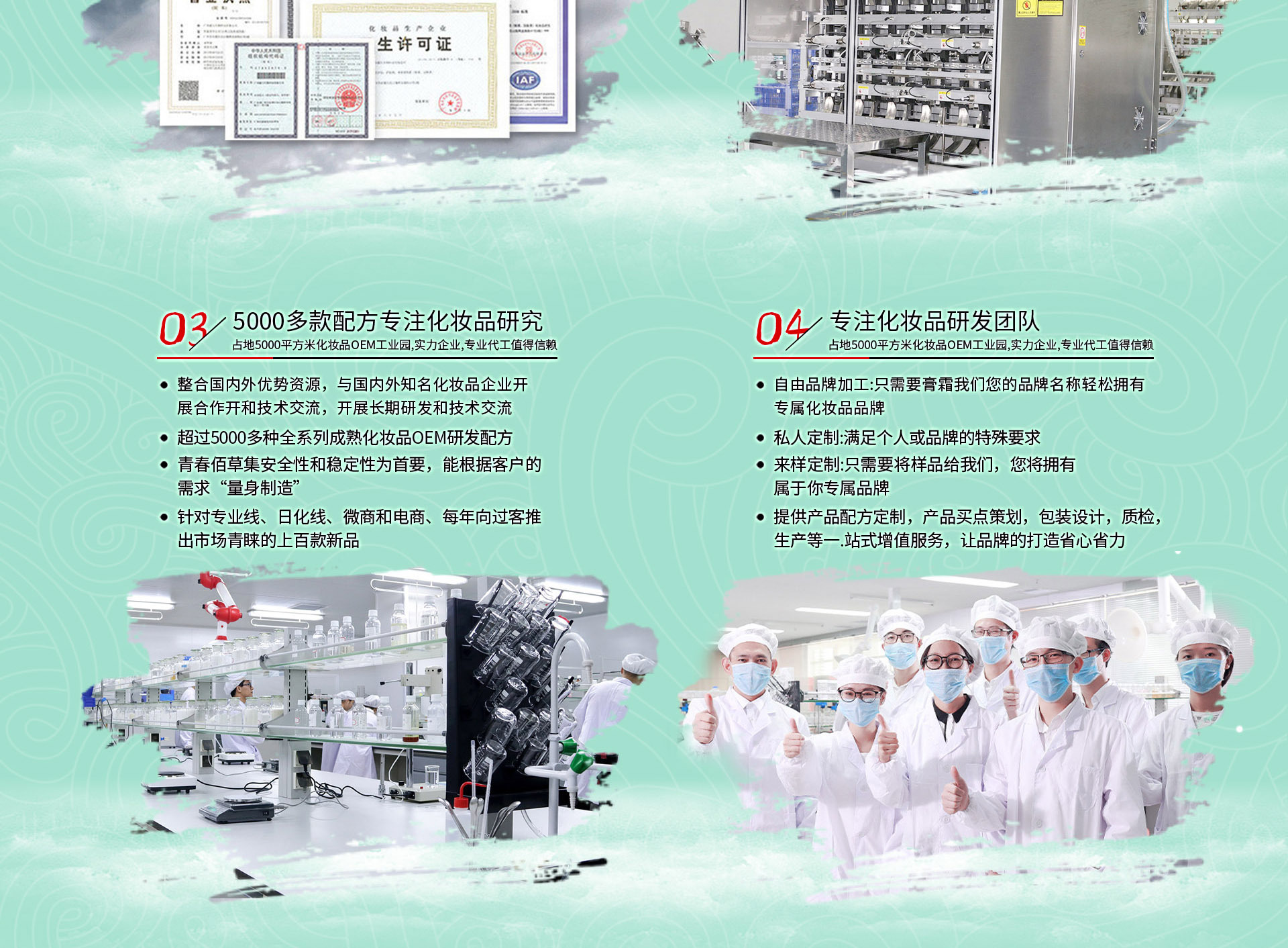廣州青春百草匯醫(yī)藥研究有限公司與廣州信御坊化妝品有限公司是孿企業(yè),廣州青春百草匯醫(yī)藥研究有限公司有限公司是一家融匯生物科技研發(fā)、生產制造、技術服務于一體的美容化妝品OEM/ODM/OBM現(xiàn)代化綜合企業(yè),公司采用國內外先進的研發(fā)技術,啟用業(yè)界先進的管理系統(tǒng),匯聚眾多國內外同行業(yè)科研技術精英,配置高端先進的生產流水線,公司以全新的經營理念為導向,以高科技為核心。以先進的設備為基礎,以優(yōu)良的研發(fā)團隊為支柱,精心打造化妝品行業(yè)OEM龍頭企業(yè),做適合各類肌膚適應的化妝品研發(fā)、生產、銷售的高端企業(yè)。涉及各類功效型護膚品,養(yǎng)生私護等系列產品,采用國內外高端進口原材料,研發(fā)新品,調配出您滿意的產品。公司位于廣州市白云區(qū),占地面積約10000平方米, 并擁有十萬級GMP孵化灌裝車間和多個國際標準化的生產車間,具備消字號、妝字號、械字號等生產資質,擁有完整、科學的質量管理體系,能夠用最短的時間