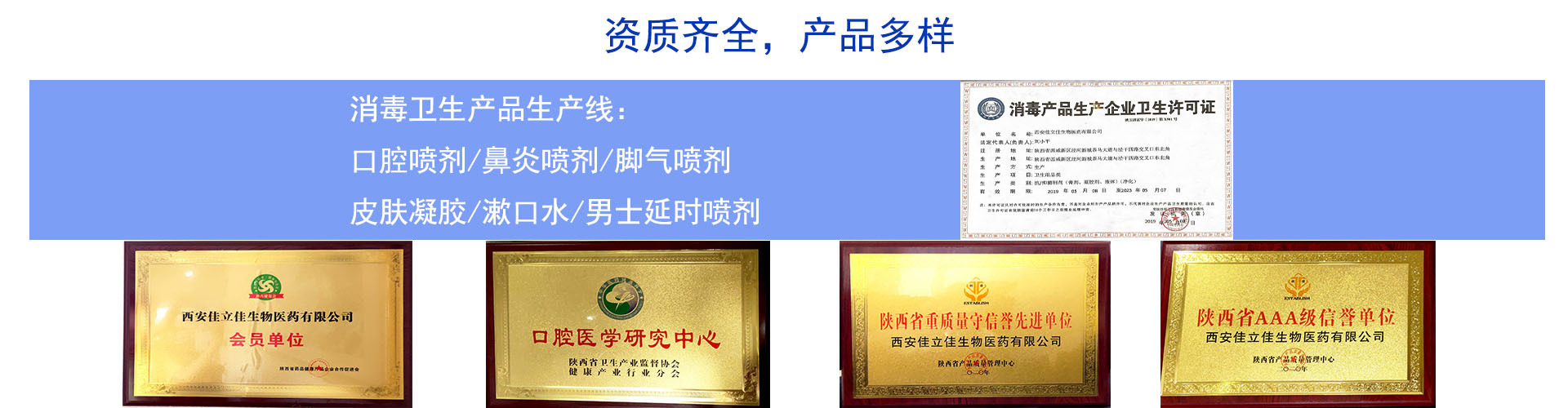 西安佳立佳生物醫藥有限公司成立于2004年,是一家專業從事衛生消毒產品、保健用品的研發、生產、銷售為一體的高新技術企業。 公司成立十余年來,一直致力于衛生消毒產品、保健用品的研發和創新。擁有眾多高級科研人才和高素質管理人員,與陜西省中醫院耳鼻喉科,第四軍醫大學藥實驗建立了良好的產品研發合作關系,為公司上市的產品奠定了雄厚的科技基礎。 口腔噴劑oem、男士噴劑oem、鼻腔噴劑oem、婦科凝膠OEM、西瓜霜、腳氣噴劑、皮膚凝膠、漱口水OEM、護理液、婦科洗液等產品專業生產加工的公司,擁有完整、科學的質量管理體系。佳立佳公司把“走行業規范之路、做自然健康的倡導者”作為公司長期戰略目標。堅持“良心做藥、誠信合作、客戶安心、顧客放心”的企業道德與經營理念。 西安佳立佳生物醫藥有限公司的誠信、實力和產品質量獲得業界的認可。歡迎各界朋友蒞臨參觀、指導和業務洽談。