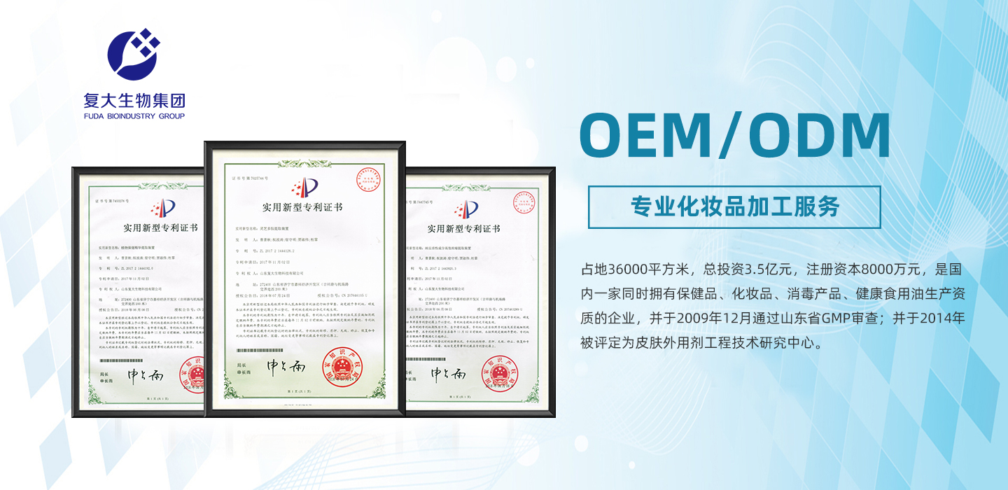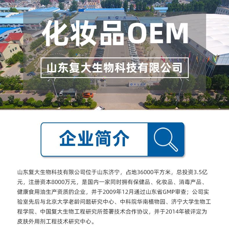 山東復大生物科技有限公司位于山東濟寧,占地36000平方米,總投資3.5億元,注冊資本8000萬元,是國內一家同時擁有保健品、化妝品、消毒產品、健康食用油生產資質的企業,并于2009年12月通過山東省GMP審查;公司實驗室先后與北京大學老齡問題研究中心、中科院華南植物園、濟寧大學生物工程學院、中國復大生物工程研究所簽署技術合作協議,并于2014年被評定為皮膚外用劑工程技術研究中心。