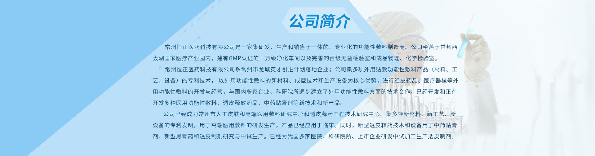 常州恒正醫藥科技有限公司坐落于常州市西太湖醫療產業孵化園內,是集研發、生產、銷售于一體的專業化外科醫療器械制造商。建有GMP認證的十萬級凈化車間以及完善的無菌檢驗室和成品物理檢驗室。依托北京化工大學、南京中醫藥大學、南京藥科大學人才技術優勢,擁有一支以醫學、藥學、高分子材料、機械加工、營銷方面不同學科交叉結合的高素質研發團隊。集多項外用貼敷產品(材料、工藝、設備)的專利技術。公司 “以外用貼敷制劑新材料、成型技術和生產設備為核心優勢,進行經皮藥品、醫療器械等外用貼敷產品”的開發經營。與國內多家企業、科研院所建立了外用貼敷制劑方面的技術合作。已經開發和正在開發多種醫用敷料、透皮釋放藥品、中藥貼膏劑等新技術和新產品。 常州恒正醫藥科技有限公司主營防塵口罩、水膠體敷料、舒鼻貼、關節保健貼、醒神保健露等。公司秉承“顧客至上,銳意進取”的經營理念,堅持“客戶第一”的原則為廣大客戶提供優質的服務。