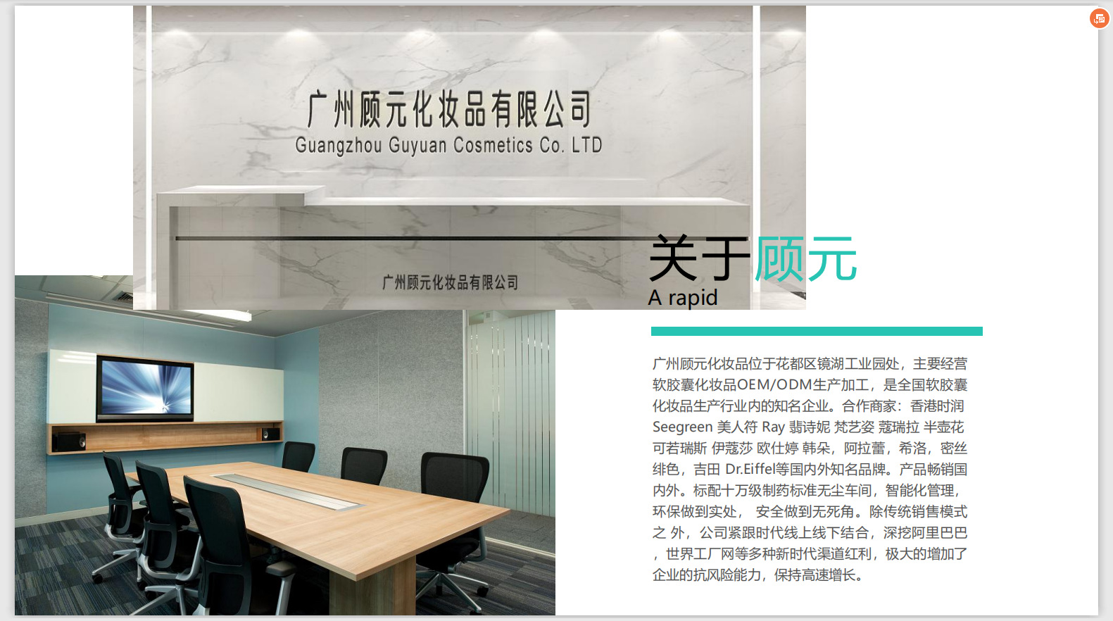 廣州顧元化妝品一家主要經(jīng)營化妝品OEM/ODM服務(wù)的生產(chǎn)加工廠,擁有13條專業(yè)全自動生產(chǎn)線,年生產(chǎn)能力36億粒。獲得ISO22716國際化妝品質(zhì)量體系認(rèn)證及歐美國家GMPC《良好操作規(guī)范》認(rèn)證。交通便利,交貨周期短。熱忱歡迎各位新老客戶來我公司參觀指導(dǎo)工作、業(yè)務(wù)洽談!工廠占地面積為1萬5千平方米,生產(chǎn)嚴(yán)格遵照GMPC生產(chǎn)標(biāo)準(zhǔn),擁有先進(jìn)的生產(chǎn)設(shè)備及一流的生產(chǎn)環(huán)境。工廠自投產(chǎn)以來,嚴(yán)格按國家各項(xiàng)政策、法規(guī)實(shí)施經(jīng)營管理,積極進(jìn)取,求實(shí)創(chuàng)新。嚴(yán)格執(zhí)行質(zhì)量體系的同時(shí)按GMPC要求組織日常全過程生產(chǎn),使每一支驗(yàn)收合格的產(chǎn)品,在市場上讓不同地區(qū)的顧客滿意,從而讓企業(yè)贏得更多顧客的青睞。