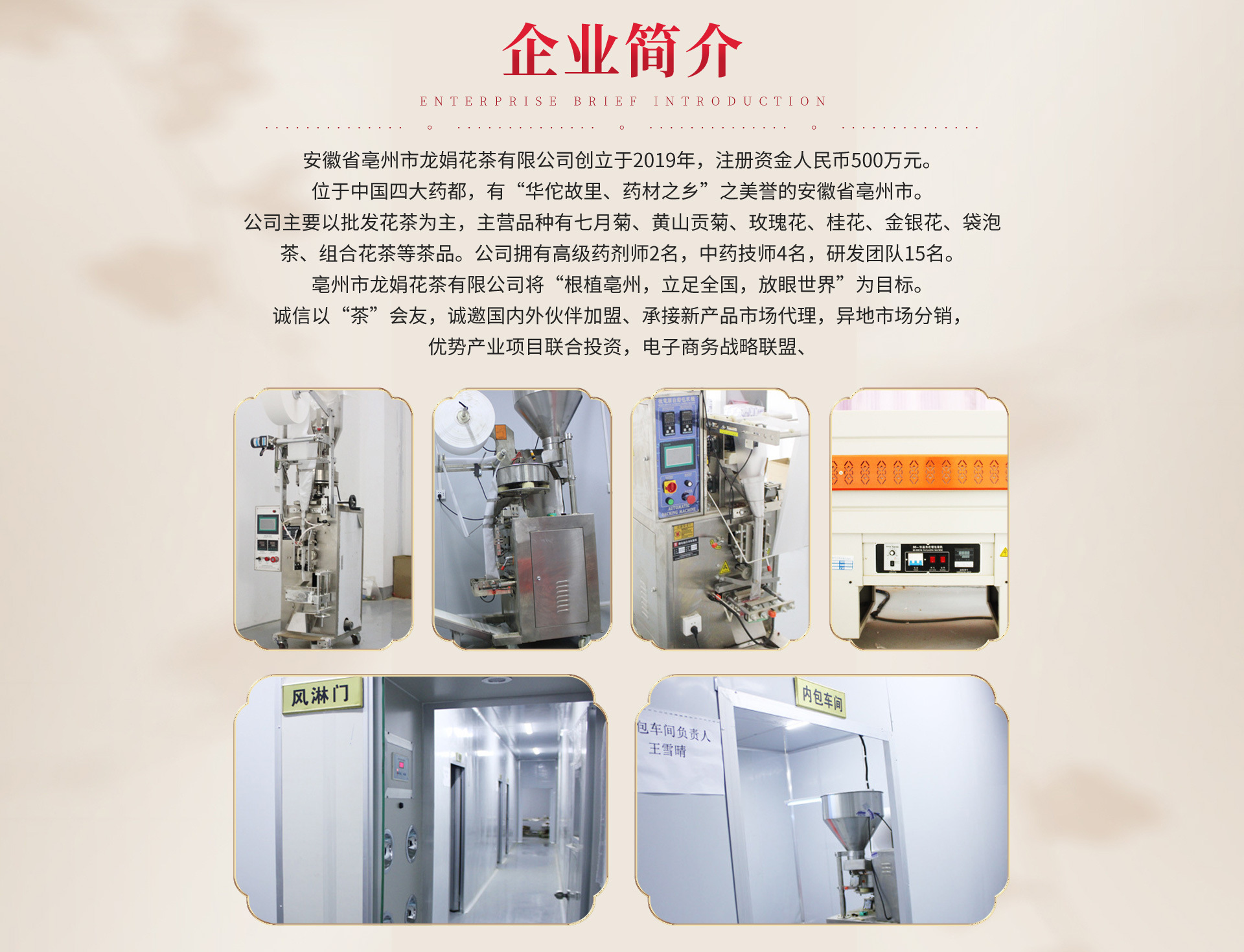 安徽省亳州市龍娟花茶有限公司創(chuàng)立于2019年,注冊資金人民幣500萬元。 位于中國四大藥都,有“華故里、藥材之鄉(xiāng)”之美譽(yù)的安徽省亳州市。 公司主要以批發(fā)花茶為主,主營品種有七月菊、黃山貢菊、玫瑰花、桂花、金銀花、袋泡 茶、組合花茶等茶品。公司擁有高級藥劑師2名,中藥技師4名,研發(fā)團(tuán)隊15名。 亳州市龍娟花茶有限公司將“根植亳州,立足全國,放眼世界”為目標(biāo)。 誠信以“茶”會友,誠邀國內(nèi)外伙伴加盟、承接新產(chǎn)品市場代理,異地市場分銷, 優(yōu)勢產(chǎn)業(yè)項目聯(lián)合投資,電子商務(wù)戰(zhàn)略聯(lián)盟