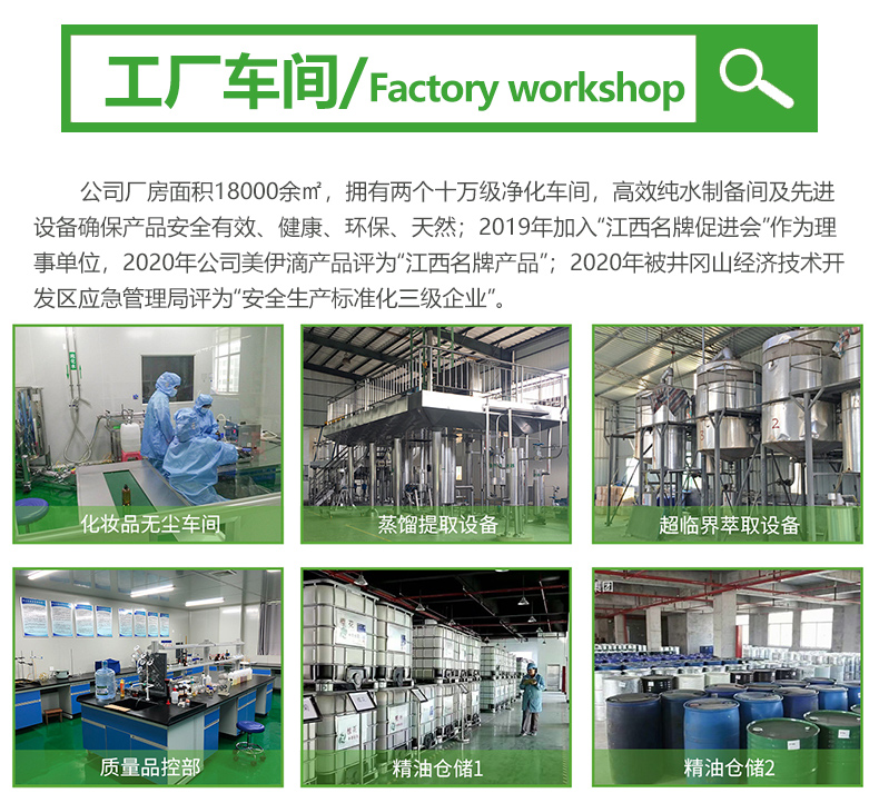 公司技術和研發實力雄厚,與江西農業大學林學院、河北大學中醫學院取得合作,建立江西農業大學林產化工專業工作站和河北大學中醫學院產學研工作站;2020年~2021年已連續兩年入庫“科技型中小企業”,2020年評為“高新技術企業”,同年與井岡山大學聯合建立“吉安市芳香精油技術創新中心”,并通過吉安市科技局審批;2021年4月成立“青原芳香精油健康產業知識產權聯盟”,公司作為聯盟主席單位。公司廠房面積18000余㎡,擁有兩個十萬級凈化車間,高效純水制備間及先進設備確保產品安全有效、健康、環保、天然;2019年加入“江西名牌促進會”作為理事單位,2020年公司美伊滴產品評為“江西名牌產品”;2020年被井岡山經濟技術開發區應急管理局評為“安全生產標準化三級企業”。