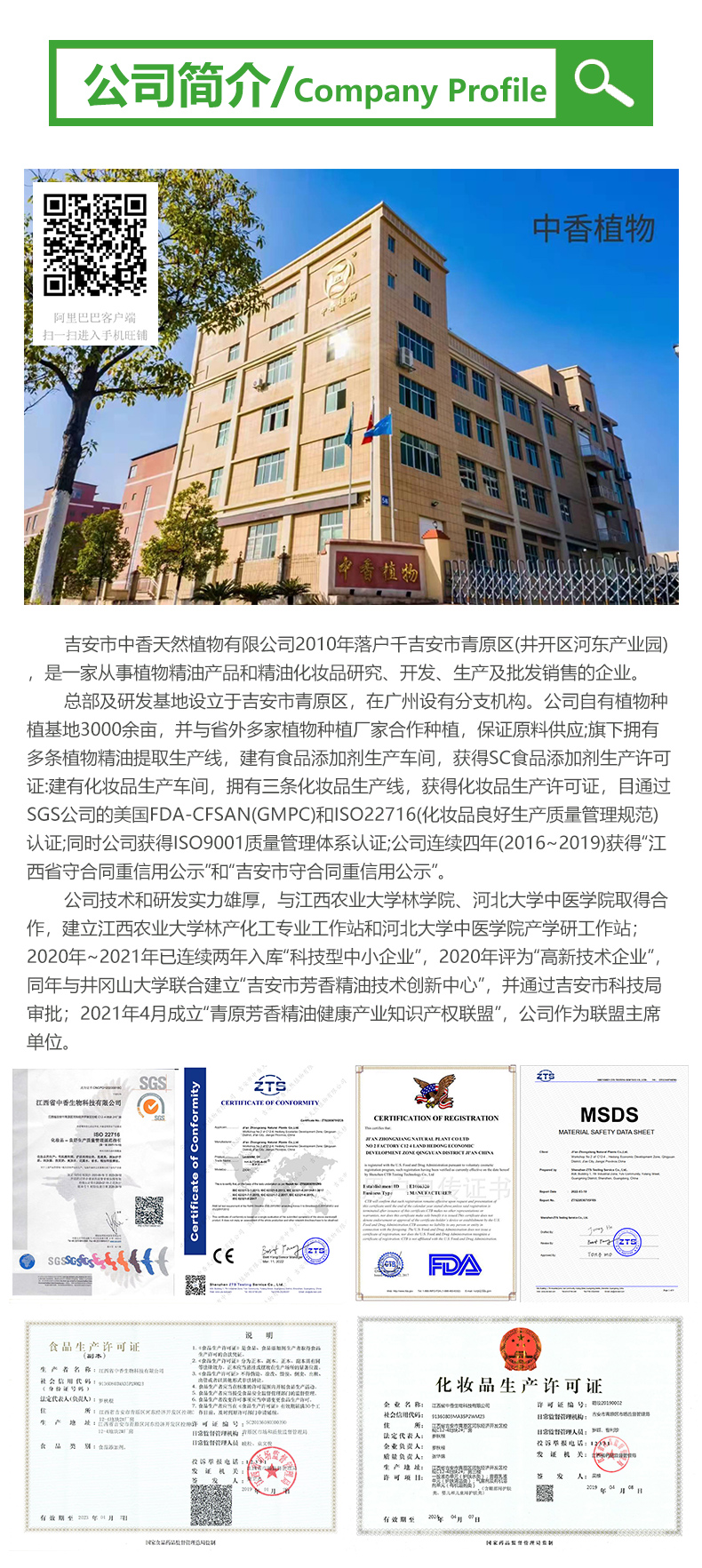 總部及研發基地設立于吉安市青原區,在廣州設有分支機構。公司自有植物種植基地3000余畝,并與省外多家植物種植廠家合作種植,保證原料供應;旗下擁有多條植物精油提取生產線,建有食品添加劑生產車間,獲得SC食品添加劑生產許可證:建有化妝品生產車間,擁有三條化妝品生產線,獲得化妝品生產許可證,目通過SGS公司的美國FDA-CFSAN(GMPC)和ISO22716(化妝品良好生產質量管理規范)認證;同時公司獲得ISO9001質量管理體系認證;公司連續四年(2016~2019)獲得“江西省守合同重信用公示”和“吉安市守合同重信用公示”。