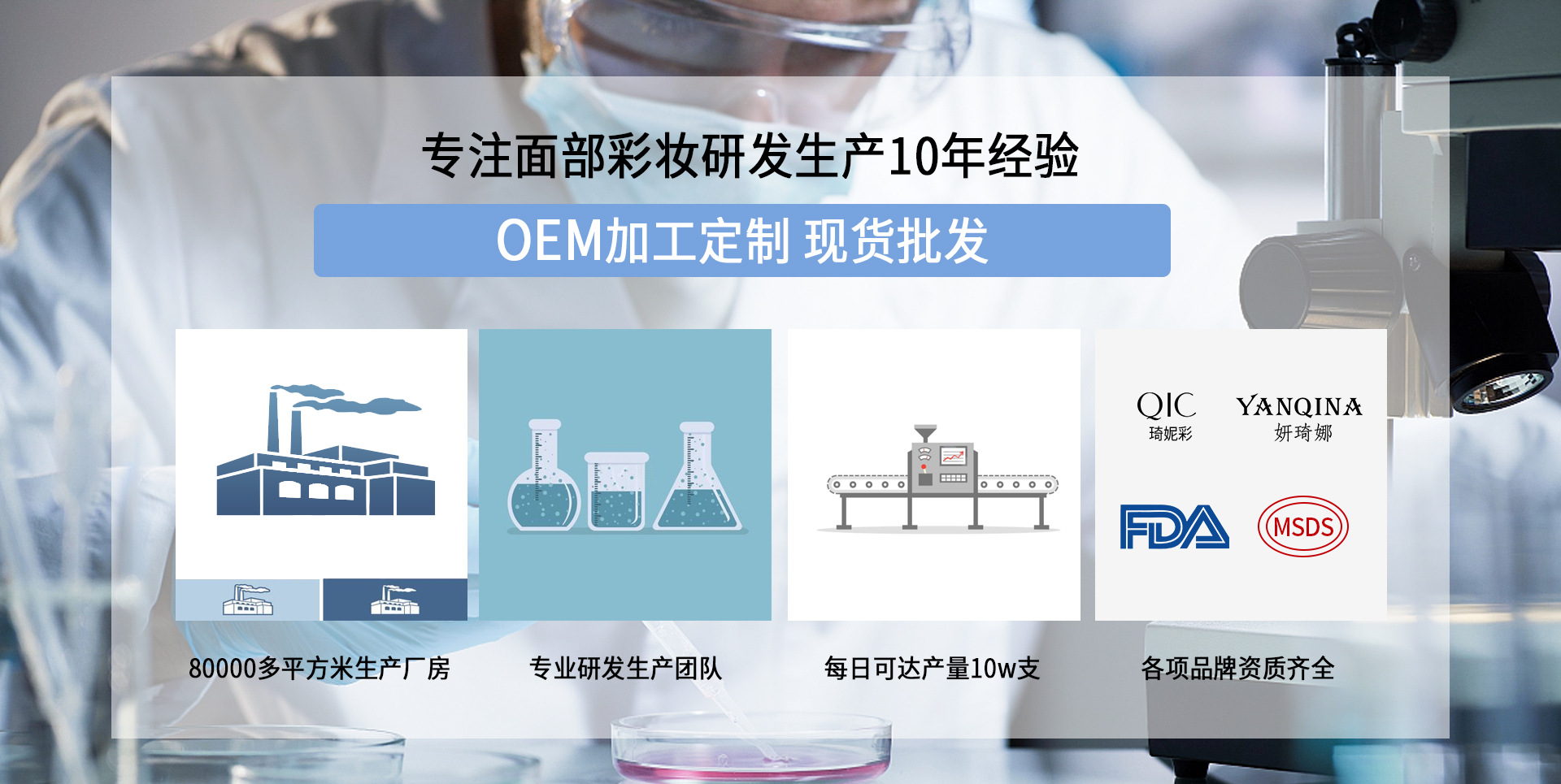 汕頭妍琦娜化妝品有限公司成立于2016年,是一家集科研、開發、生產、銷售、服務為一體的專業化妝品生產企業。本公司主要生產:眼線液、睫毛膏、眉筆、粉底、遮瑕、口紅、唇膏、唇釉等彩妝系列產品的企業。 公司旗下持有YANQINA/妍琦娜、QIC/琦妮彩等彩妝品牌,品牌資質齊全;深受國內外廣大客戶青睞