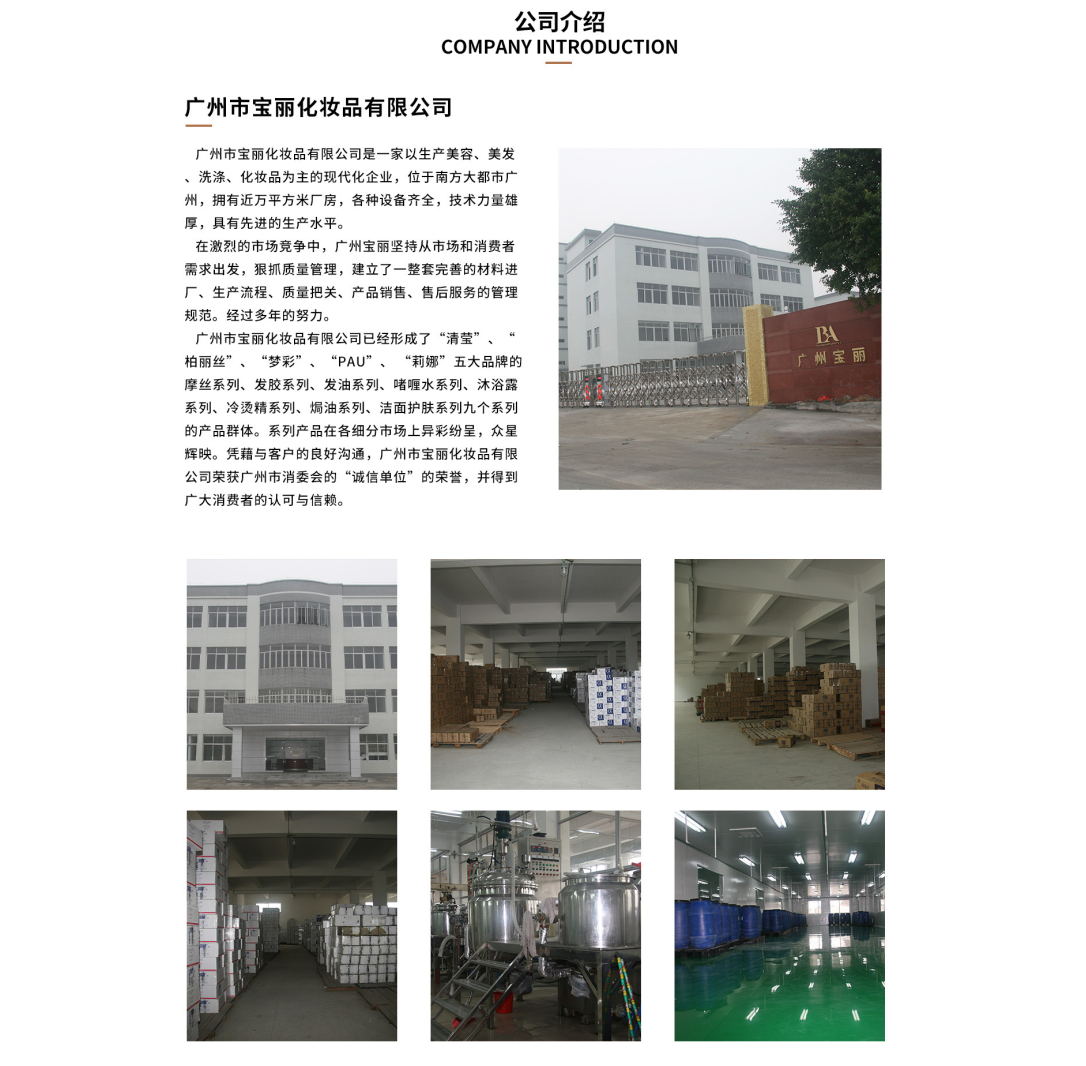 廣州市寶麗化妝品有限公司是一家以生產美容、美發、洗滌、化妝品為主的現代化企業,位于南方大都市廣州,擁有近萬平方米廠房,各種設備齊全,技術力量雄厚,具有先進的生產水平。 在激烈的市場競爭中,廣州寶麗堅持從市場和消費者需求出發,狠抓質量管理,建立了一整套完善的材料進廠、生產流程、質量把關、產品銷售、售后服務的管理規范。經過多年的努力,廣州市寶麗化妝品有限公司已經形成了“清瑩”、“柏麗絲”、“夢彩”、“PAU”、 “莉娜”五大品牌的摩絲系列、發膠系列、發油系列、啫喱水系列、沐浴露系列、冷燙精系列、焗油系列、潔面護膚系列九個系列的產品群體。系列產品在各細分市場上異彩紛呈,眾星輝映。憑藉與客戶的良好溝通,廣州市寶麗化妝品有限公司榮獲廣州市消委會的“誠信單位”的榮譽,并得到廣大消費者的認可與信賴。