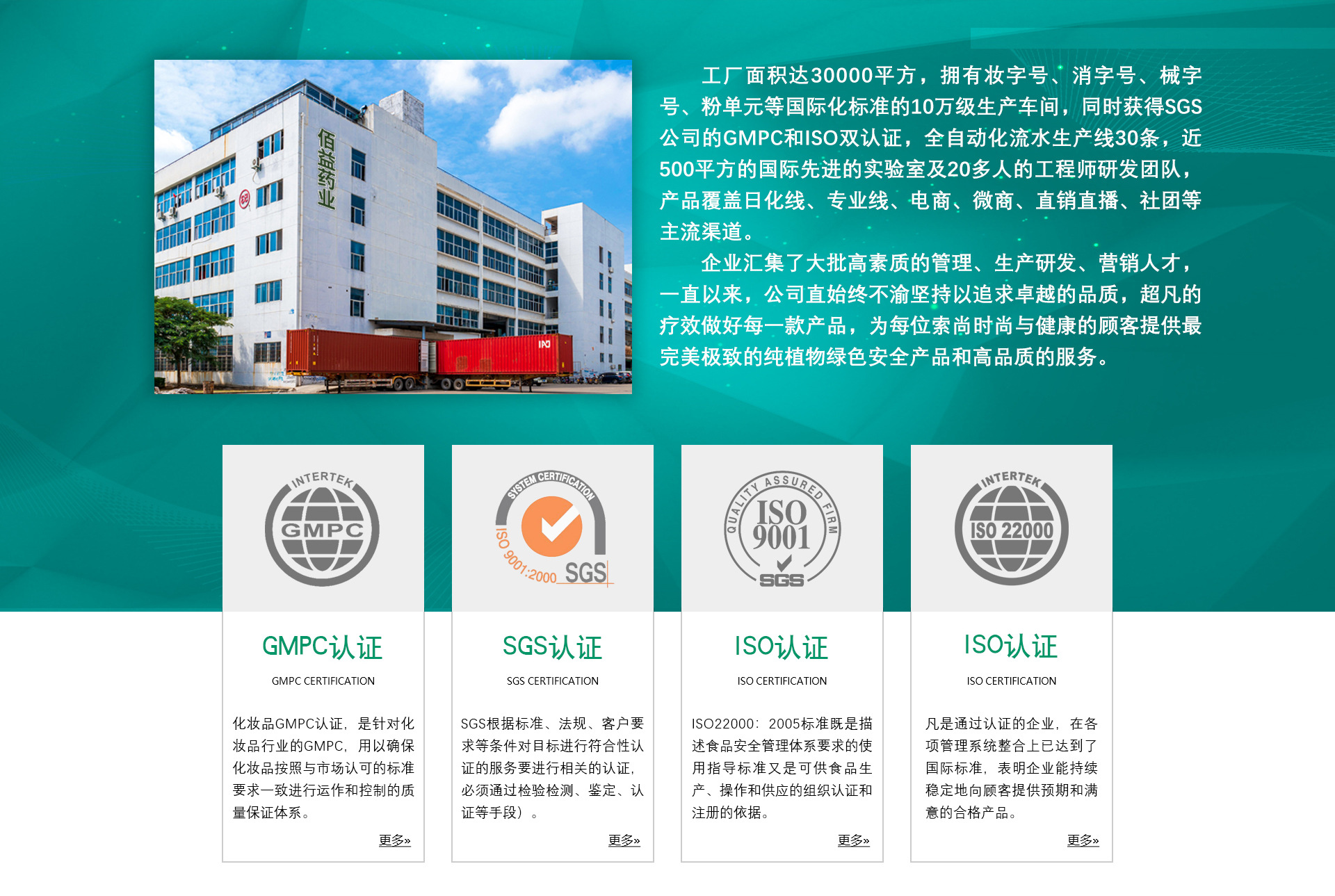 廣州佰益藥業有限公司:十年專注女性私密系列,減肥養生系列,護膚系列,工廠占地面積三萬平方,專業生產加工的公司,是一家專業從事中高檔化妝品研究、生產、加工貼牌的生產廠家,擁有妝字號、消字號、械字號,粉單元等國際化標準的10萬級生產車間,同時獲得SGS公司的GMPC和ISO雙認證,全自動化流水生產線18條,500平方的國際先進的實驗室及20多人的工程師研發團隊,先進而精密的實驗設備器材,檢測重金屬的原子吸收儀,定性,定量檢測的紫外分光光度計,液相色譜儀,測揮發物質的氣相色譜儀,測膏體細膩度的微晶檢測儀和高倍顯微鏡。對于配方設計、檢測、打樣、微生物檢測等多項能力更是具有行業先進水平。 佰益藥業 秉承“創新、匠心、誠信、服務、激情”的價值理念,從商標注冊、產品策劃、包裝設計與采購、倉儲管理等層層把關,為客戶的品牌保駕護航;產品覆蓋日化線、專業線、電商、微商、直銷、直播、社團等主流渠道。