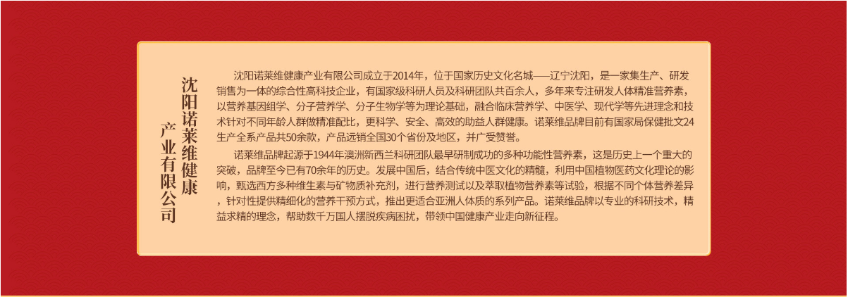 沈陽(yáng)諾萊維健康產(chǎn)業(yè)有限公司主營(yíng)保健食品、保健食品,經(jīng)國(guó)家工商部門批準(zhǔn)注冊(cè),沈陽(yáng)諾萊維健康產(chǎn)業(yè)有限公司具備保健食品、保健食品的招商代理資格。 公司成立于2014年,位于國(guó)家歷史文化名城——遼寧沈陽(yáng),是一家集生產(chǎn)、研發(fā)、銷售為一體的綜合性高科技企業(yè),有國(guó)家級(jí)科研人員及科研團(tuán)隊(duì)共百余人,多年來(lái)專注研發(fā)人體精準(zhǔn)營(yíng)養(yǎng)素,以營(yíng)養(yǎng)基因組學(xué)、分子營(yíng)養(yǎng)學(xué)、分子生物學(xué)等為理論基礎(chǔ),融合臨床營(yíng)養(yǎng)學(xué)、中醫(yī)學(xué)、現(xiàn)代醫(yī)學(xué)等先進(jìn)理念和技術(shù),針對(duì)不同年齡人群做精準(zhǔn)配比,更科學(xué)、安全、高效的助益人類健康。 諾萊維品牌目前有國(guó)家局保健批文24個(gè),生產(chǎn)全系產(chǎn)品共50余款,產(chǎn)品遠(yuǎn)銷全國(guó)30個(gè)省份及地區(qū),并廣受贊譽(yù)。 沈陽(yáng)諾萊維健康產(chǎn)業(yè)有限公司以優(yōu)質(zhì)的產(chǎn)品質(zhì)量,廣闊的市場(chǎng)前景,豐厚的代理待遇,強(qiáng)大的代理優(yōu)勢(shì),讓您創(chuàng)業(yè)投資不再難,熱誠(chéng)歡迎各位有志之士前來(lái)實(shí)地參觀和考察。