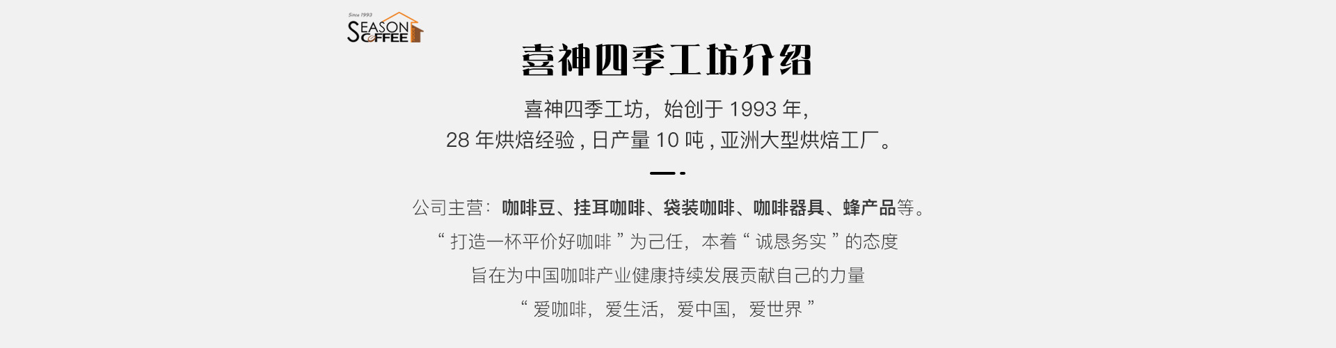 喜神杭州食品有限公司,始于1993年,是一家中國大型的咖啡豆烘焙商,年咖啡豆設(shè)計吞度量可達近萬噸,公司產(chǎn)品以咖啡豆烘焙,咖啡粉,濾掛咖啡和袋泡咖啡為主。坐落在浙江杭州濱江區(qū),毗鄰阿里巴巴濱江園區(qū),旨在通過結(jié)合電子商務(wù)加大喜神咖啡的市場規(guī)模。 公司咖啡豆來自世界主要產(chǎn)區(qū),包括南美洲,北美洲,亞洲和非洲等等產(chǎn)區(qū)。 公司在2017年引進全新意大利大型烘焙設(shè)備,經(jīng)過1年多的裝修調(diào)試,于2018年建成國內(nèi)專業(yè)大型的烘焙設(shè)備,引進360公斤級烘焙設(shè)備等等。 喜神咖啡致力于打造“一杯平價好咖啡”,通過專業(yè)的技術(shù)和設(shè)備以及從業(yè)30年的經(jīng)驗,對咖啡樹種植,咖啡豆采摘和處理以及運輸?shù)鹊冗M行全方位監(jiān)控和跟蹤,達到對咖啡生豆的深入全面熟悉。 喜神咖啡通過了ISO22000,HACCP,雨林認證,清正認證等等,喜神有專業(yè)冠軍咖啡師堅持杯測,研發(fā)新品是喜神咖啡創(chuàng)新的基礎(chǔ)。 喜神咖啡愿和廣大的伙伴一道促進咖啡發(fā)展