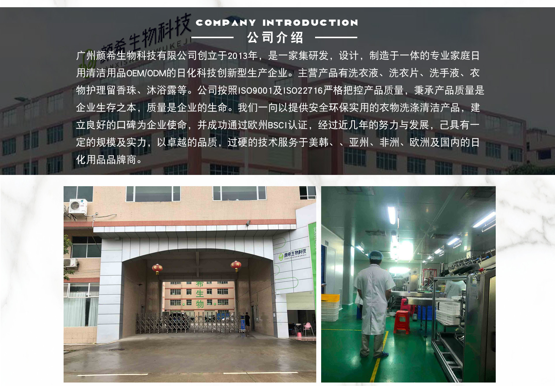 廣州顏希生物科技有限公司主營洗發水、護發素、沐浴露、洗衣片、發膜、洗衣液、洗衣凝珠、洗面奶、洗手液等。公司秉承“顧客至上,銳意進取”的經營理念,堅持“客戶第一”的原則為廣大客戶提供優質的服務。