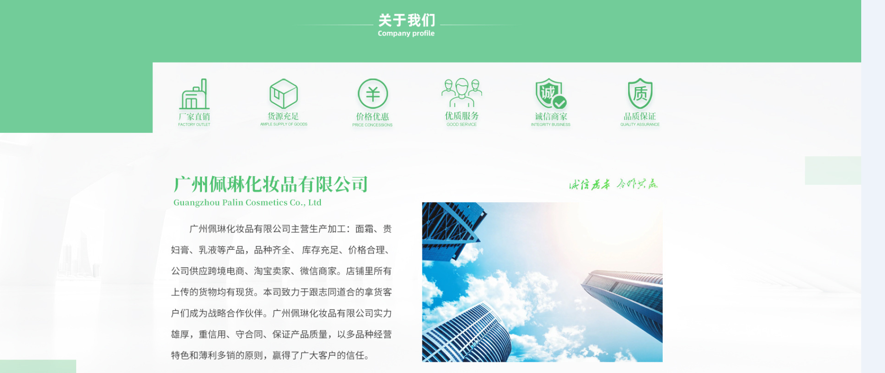廣州佩琳化妝品有限公司是面霜、貴婦膏、乳液等產品專業生產加工的公司,擁有完整、科學的質量管理體系。廣州佩琳化妝品有限公司的誠信、實力和產品質量獲得業界的認可。歡迎各界朋友蒞臨參觀、指導和業務洽談。