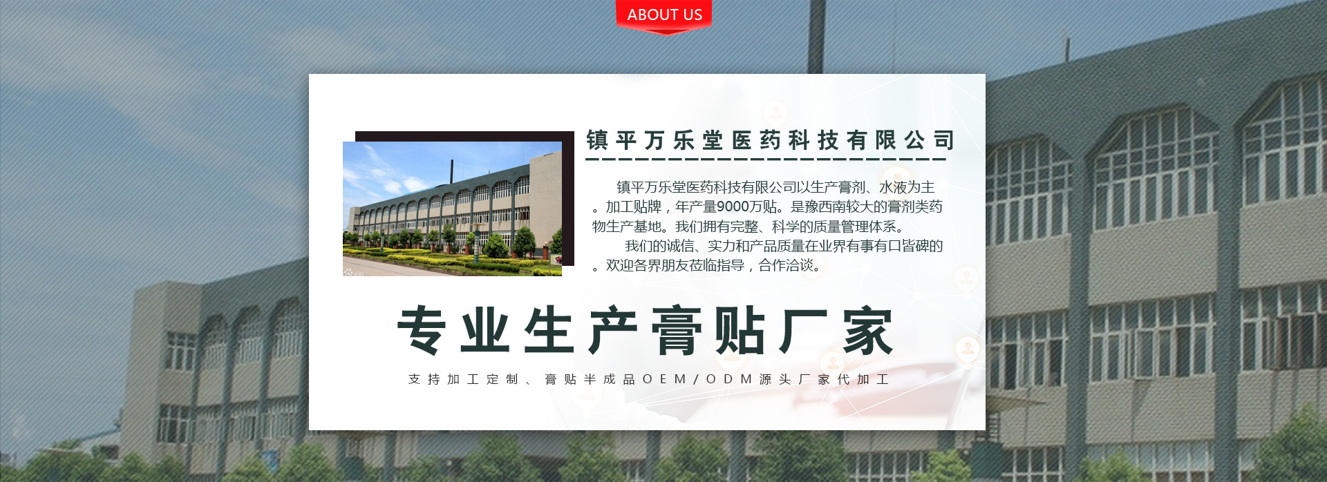 鎮平萬樂堂醫藥科技有限公司,公司坐落于鎮平工業園區,占地50畝,公司廠房建筑面積10000平方米。擁有生產車間3個,擁有膏藥、膏劑、水劑、泡腳粉分裝生產線,主要生產膏藥、水劑等各種劑型的保健產品,本公司主要以生產膏藥、水劑為主。加工貼牌,生產各種黑膏藥、巴布貼及各種膏藥。年產9000萬貼,是豫西南較大的膏藥生產基地。 本公司擁有自主研發的知名產品。 本公司主要經營:黑膏藥、膏藥加工、膏藥貼牌、來料加工、膏藥批發、腱鞘貼、滑膜貼、脈管炎貼、jianfei貼、zhitong貼等產品專業生產加工的公司,擁有完整、科學的質量管理體系。 鎮平萬樂堂醫藥科技有限公司的誠信、實力和產品質量獲得業界的認可。歡迎各界朋友蒞臨參觀、指導和業務洽談。