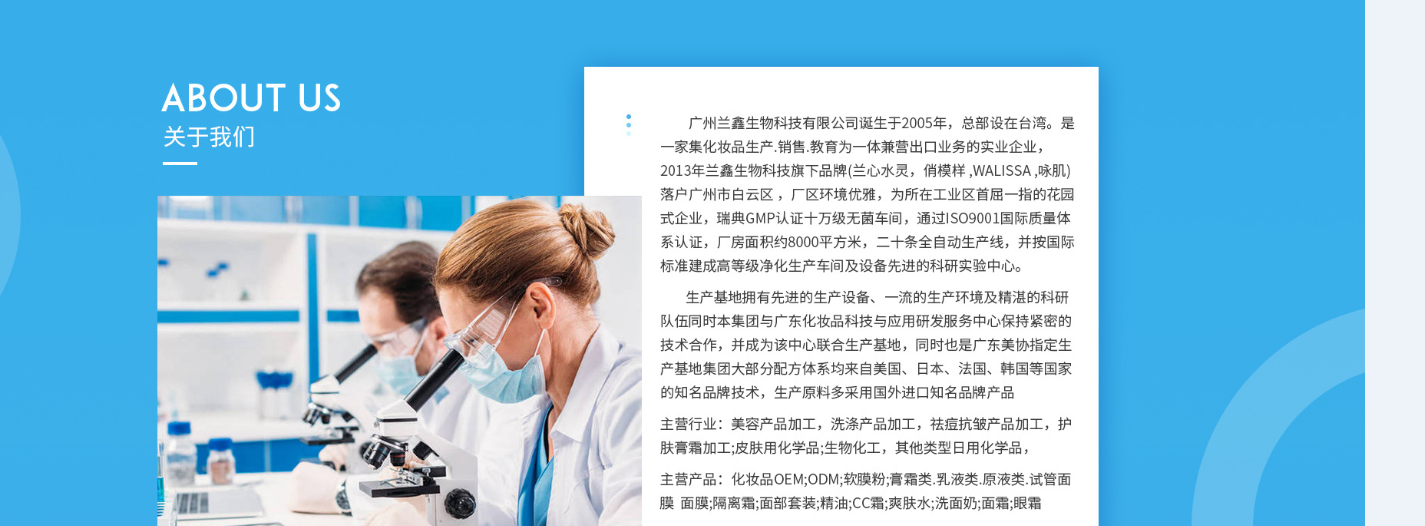 廣州蘭鑫生物科技有限公司,是一家集臨床醫療、化妝品加工、面膜粉OEM代加工、化妝品oem、化妝品研發、生產、銷售、美容服務為一體的國際化化妝品公司,擁有12年的化妝品加工經驗,一流的現代化生產基地和擁有12條國際化生產流水線,十萬級空氣凈化標準GMP車間,公司承諾10萬支水光針、10萬片面膜均可當天發貨,強大的研發團隊,優良的中藥配方,一站式的服務交付,只要您想得到的,我們都可以為您做到,歡迎隨時咨詢!