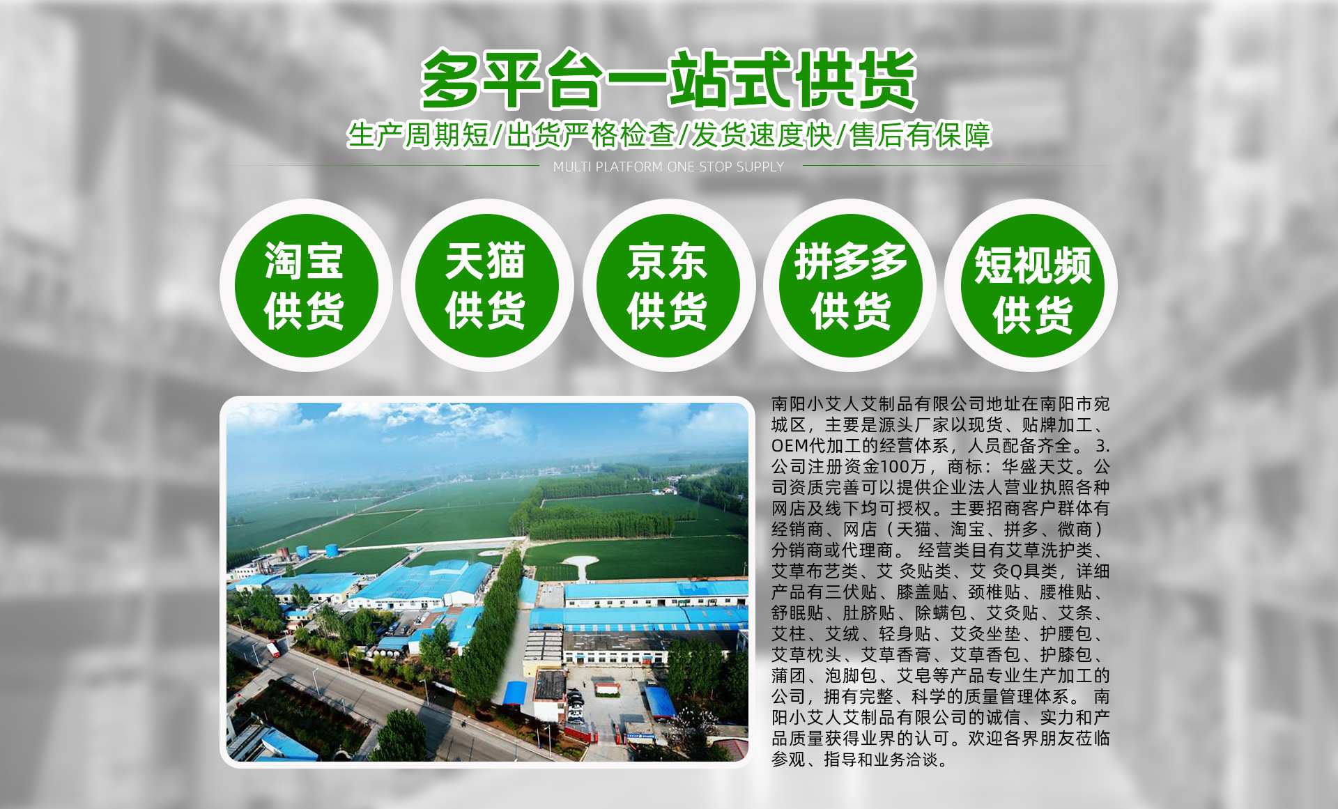 南陽小艾人艾制品有限公司地址在南陽市宛城區(qū),主要是源頭廠家以現(xiàn)貨、貼牌加工、OEM代加工的經營體系,人員配備齊全。 3.公司注冊資金100萬,商標:華盛天艾。公司資質完善可以提供企業(yè)法人營業(yè)執(zhí)照各種網店及線下均可授權。主要招商客戶群體有經銷商、網店(天貓、淘寶、拼多、微商)分銷商或代理商。 經營類目有艾草洗護類、艾草布藝類、艾 灸貼類、艾 灸Q具類,詳細產品有三伏貼、膝蓋貼、頸椎貼、腰椎貼、舒眠貼、肚臍貼、除螨包、艾灸貼、艾條、艾柱、艾絨、輕身貼、艾灸坐墊、護腰包、艾草枕頭、艾草香膏、艾草香包、護膝包、蒲團、泡腳包、艾皂等產品專業(yè)生產加工的公司,擁有完整、科學的質量管理體系。 南陽小艾人艾制品有限公司的誠信、實力和產品質量獲得業(yè)界的認可。歡迎各界朋友蒞臨參觀、指導和業(yè)務洽談。