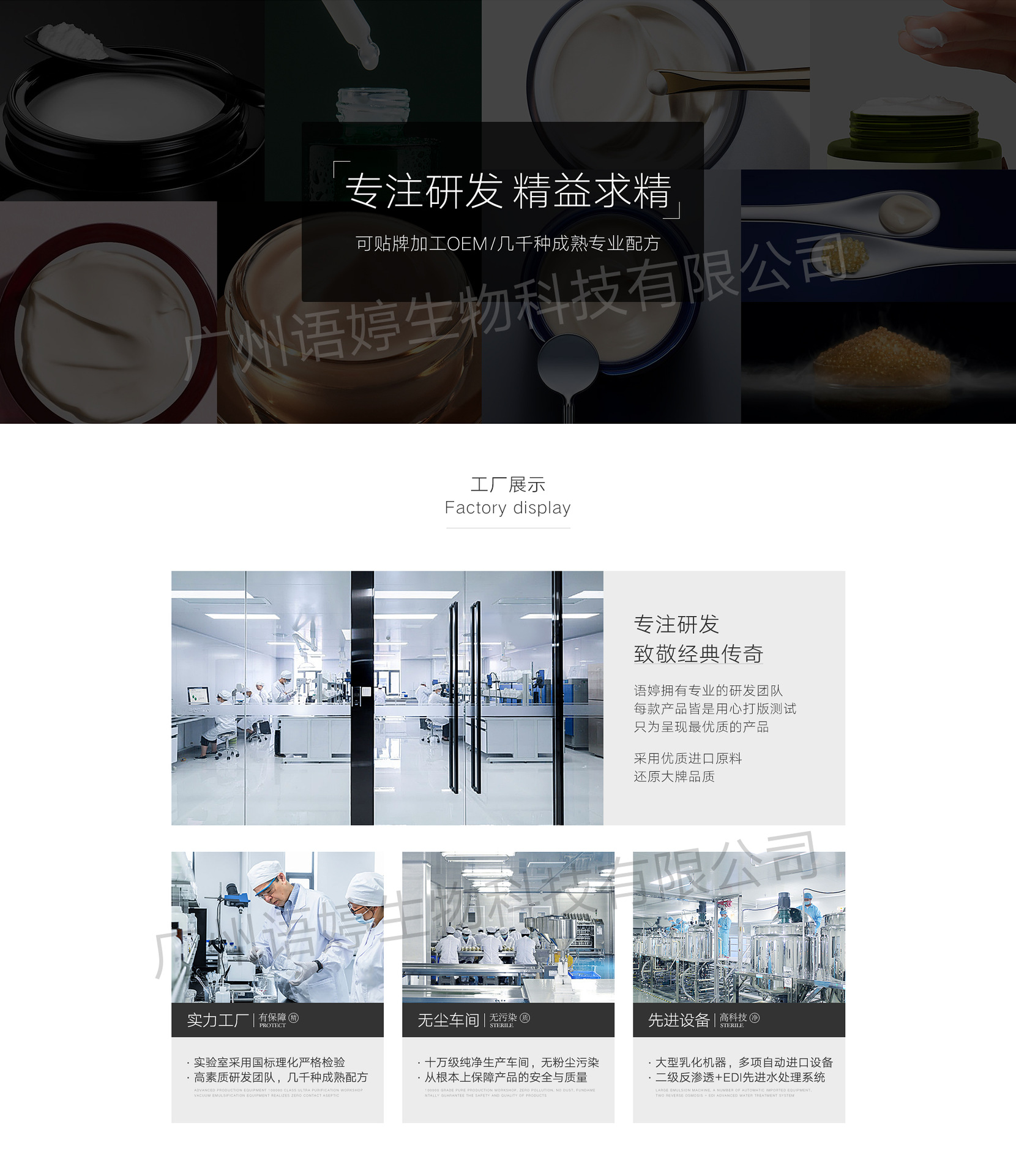 廣州語婷生物科技有限公司,是一家集生產、銷售、研發于一體的化妝品工廠,擁有先進的機器設備、醫藥級車間、乳化間以及嚴謹的科研隊伍,我公司研發的多款產品成功的幫客戶打開了市場,并在生產銷售中不斷提高產品質量、提升產品品質,成功幫助消費者占領中高市場。我司研發生產的面膜、洗面奶、水乳膏霜等護膚品以及洗發水、沐浴露等日化用品、彩妝等受到了廣大消費者的歡迎!公司與多家零售商和代理商建立了長期穩定的合作關系。我司生產、經銷的護膚品、日化用品、彩妝品種齊全、價格合理。兼以我司實力雄厚,重信用、守合同、保證產品質量,以多品種經營特色和薄利多銷的原則,贏得了廣大客戶的信任。歡迎各界朋友蒞臨參觀、指導和業務洽談!