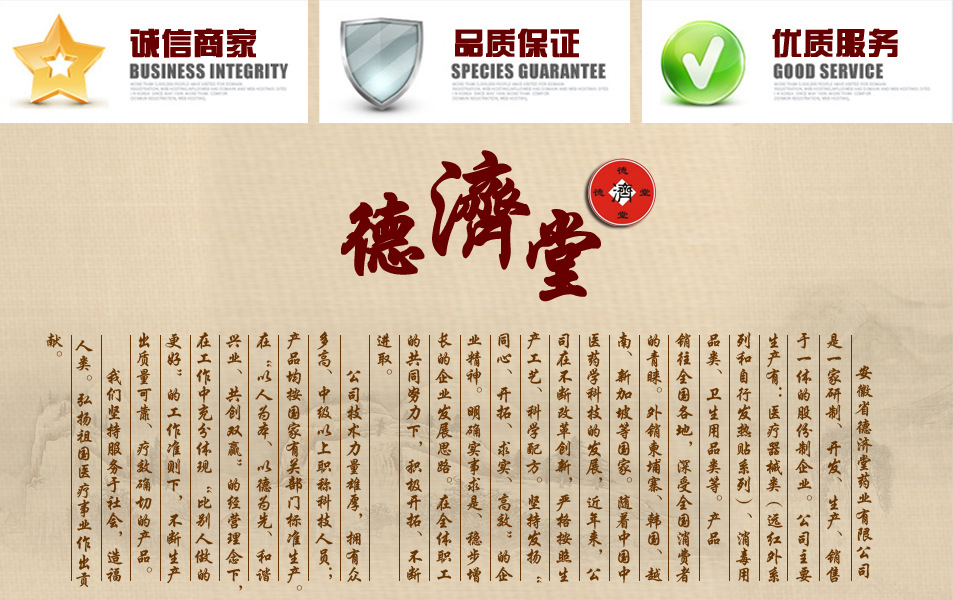安徽省德濟(jì)堂藥業(yè)有限公司是一家研制、開發(fā)、生產(chǎn)、銷售于一體的股份制企業(yè)。公司主要生產(chǎn)有:醫(yī)療器械類(遠(yuǎn)紅外系列貼貼劑、自行發(fā)熱貼系列)、消毒用品類、衛(wèi)生用品類等。產(chǎn)品銷往全國各地,深受全國消費(fèi)者的青睞。外銷柬埔寨、韓國、越南、新加坡等國家。隨著中國中醫(yī)藥學(xué)科技的發(fā)展,近年來,公司在不斷改革創(chuàng)新,嚴(yán)格按照生產(chǎn)工藝、科學(xué)配方。堅(jiān)持發(fā)揚(yáng)“同心、開拓、求實(shí)、高效”的企業(yè)精神。明確實(shí)事求是、穩(wěn)步增長的企業(yè)發(fā)展思路。在全體職工的共同努力下,積極開拓、不斷進(jìn)取,現(xiàn)已發(fā)展成為具有現(xiàn)代化專業(yè)流水線生產(chǎn)二類醫(yī)療器械(遠(yuǎn)紅外貼劑)的企業(yè)。 公司技術(shù)力量雄厚,擁有眾多高、中級以上職稱科技人員;產(chǎn)品均按國家有關(guān)部門標(biāo)準(zhǔn)生產(chǎn),生產(chǎn)設(shè)備先進(jìn),工藝管理嚴(yán)密,監(jiān)測手段完善,認(rèn)真貫徹ISO9000質(zhì)量體系標(biāo)準(zhǔn)。