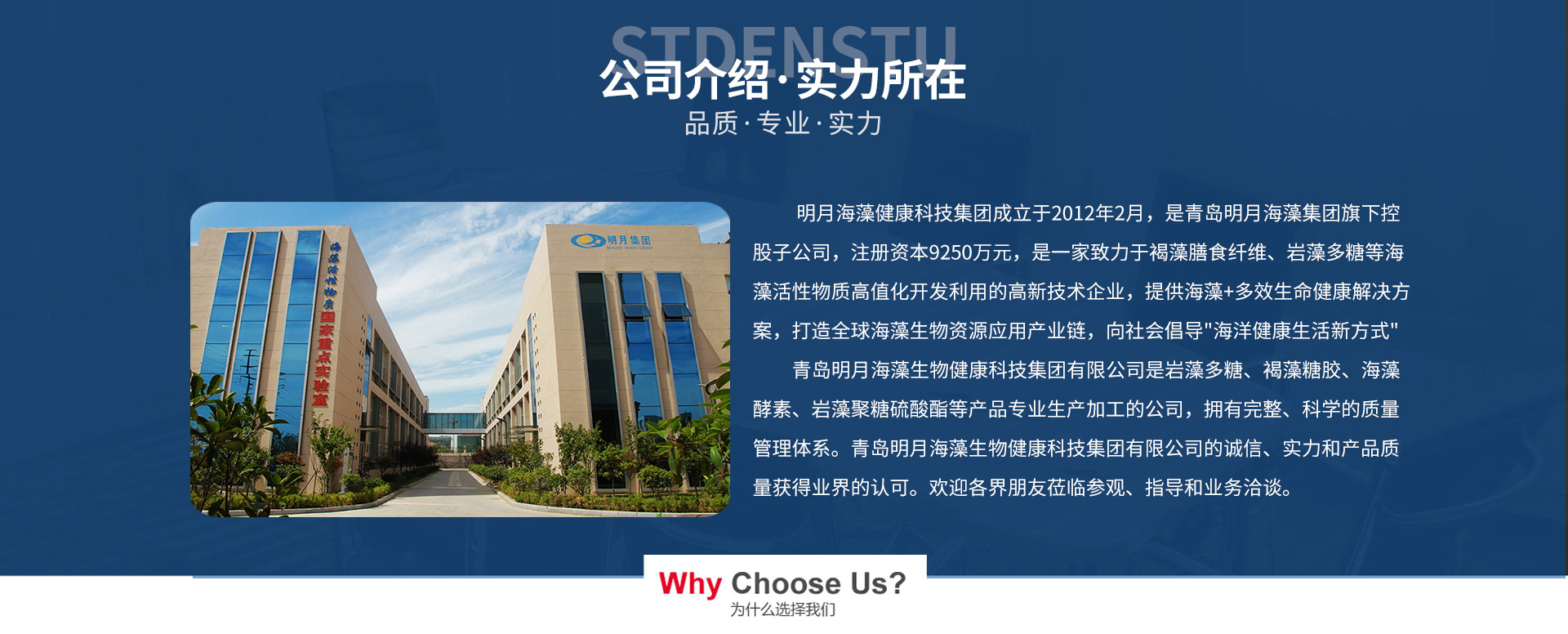 明月海藻健康科技集團(tuán)成立于2012年2月,是青島明月海藻集團(tuán)旗下控股子公司,注冊資本9250萬元,是一家致力于褐藻膳食纖維、巖藻多糖等海藻活性物質(zhì)高值化開發(fā)利用的高新技術(shù)企業(yè),提供海藻+健康解決方案,打造全球海藻生物資源應(yīng)用產(chǎn)業(yè)鏈,向社會倡導(dǎo)"海洋健康生活新方式"。 青島明月海藻生物健康科技集團(tuán)有限公司是巖藻多糖、褐藻糖膠、海藻酵素、巖藻聚糖硫酸酯等產(chǎn)品專業(yè)生產(chǎn)加工的公司,擁有完整、科學(xué)的質(zhì)量管理體系。青島明月海藻生物健康科技集團(tuán)有限公司的誠信、實(shí)力和產(chǎn)品質(zhì)量獲得業(yè)界的認(rèn)可。歡迎各界朋友蒞臨參觀、指導(dǎo)和業(yè)務(wù)洽談。