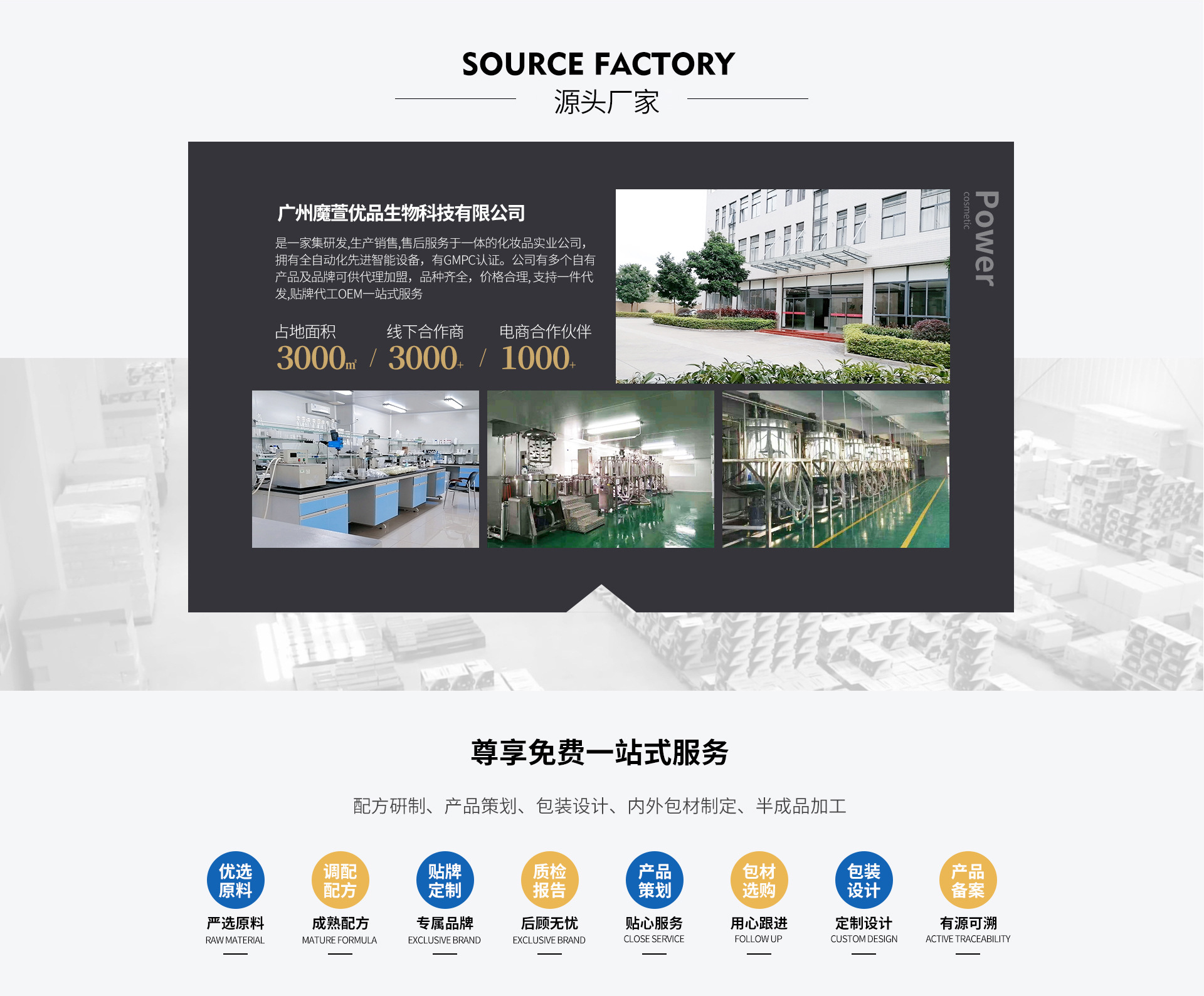 廣州魔萱優(yōu)品生物科技有限公司是一家集研發(fā),生產(chǎn)銷售,售后服務(wù)于一體的化妝品實(shí)業(yè)公司,工廠生產(chǎn)車間有3000平方米,全自動(dòng)化先進(jìn)智能設(shè)備,有GMPC認(rèn)證,GMPC認(rèn)證。主營(yíng)產(chǎn)品包括:洗發(fā)水,護(hù)發(fā)素,沐浴露,護(hù)手霜,面膜,身體乳,嬰兒洗護(hù)沐系列產(chǎn)品及頭發(fā)造型品(定型干膠,發(fā)膠,啫喱,精油)等,公司有多個(gè)自有產(chǎn)品及品牌可供代理加盟,品種齊全,價(jià)格合理,支持一件代發(fā),貼牌代工OEM一站式服務(wù),現(xiàn)有3000多家線下實(shí)體分銷商以及1000以上的電商合作團(tuán)隊(duì)。公司產(chǎn)品在歐美和東南亞國(guó)家及大陸周邊地區(qū)都受到消費(fèi)者較高的好評(píng),一直保持良好的市場(chǎng)口杯。 公司堅(jiān)持以“誠(chéng)信,專業(yè),合作,共贏”為經(jīng)營(yíng)理念,期待能為您提供高品質(zhì)的產(chǎn)品和服務(wù),歡迎來廠參觀指導(dǎo),洽談合作!