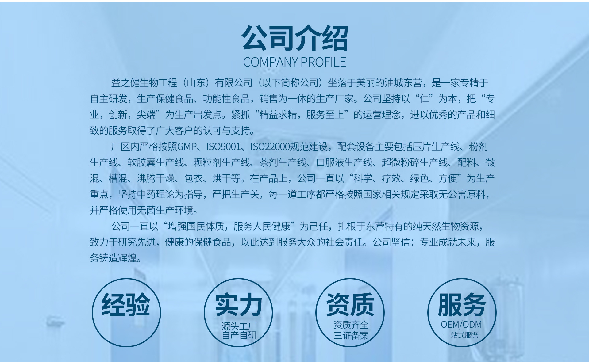 益之健生物工程(山東)有限公司是保健食品代加工、功能性食品代加工、片劑代加工、粉劑代加工、軟膠囊代工、口服液代工、植物提取物等產品專業生產加工的公司,擁有完整、科學的質量管理體系。益之健生物工程(山東)有限公司(以下簡稱公司),是一家專精于自主研發,生產保健食品、功能性食品,銷售為一體的生產廠家。公司,堅持以“仁”為本,把“專業,創新,尖端”為生產出發點。緊抓“精益求精,服務至上”的運營理念,進以優秀的產品和細致的服務取得了廣大客戶的認可與支持。 廠區內嚴格按照GMP、ISO9001、ISO22000規范建設,配套設備主要包括壓片生產線、粉劑生產線、軟膠囊生產線、顆粒劑生產線、茶劑生產線、口服液生產線、超微粉碎生產線、配料、微混、槽混、沸騰干燥、包衣、烘干等。 在產品上,公司一直以“科學、療效、綠色、方便”為生產重點,堅持中藥理論為指導,嚴把生產關,每一道工序都嚴格按照國家相關規定采取無公害原料,并嚴格使用無菌生產環境。 公司一直以“增強國民體質,服務人民健康”為己任,扎根于東營特有的純天然生物資源,致力于研究先進,健康的保健食品,以此達到服務大眾的社會責任。公司堅信:專業成就未來,服務鑄造輝煌。