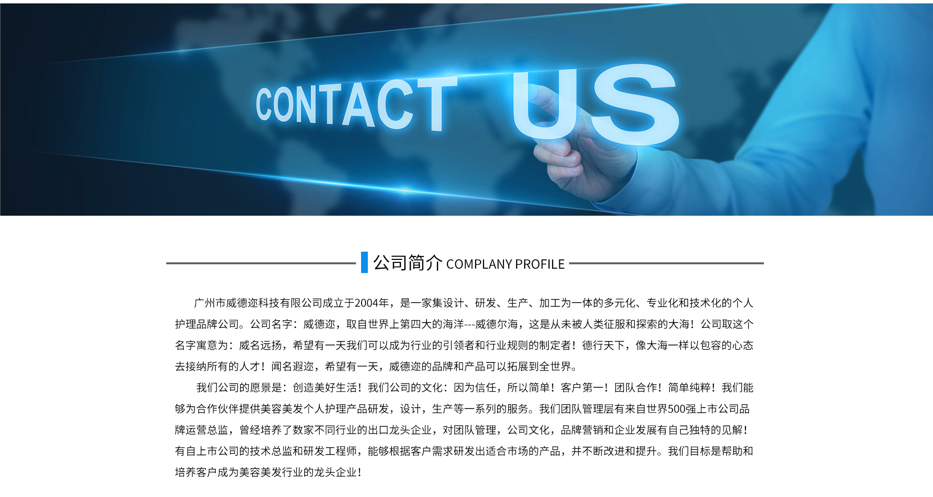 廣州市威德邇科技有限公司成立于2004年,是一家集設計、研發、生產、加工為一體的多元化、專業化和技術化的個人護理品牌公司。公司名字:威德邇,取自世界上第四大的海洋---威德爾海,這是從未被人類征服和探索的大海!公司取這個名字寓意為:威名遠揚,希望有一天我們可以成為行業的引領者和行業規則的制定者!德行天下,像大海一樣以包容的心態去接納所有的人才!聞名遐邇,希望有一天,威德邇的品牌和產品可以拓展到全世界。 我們公司的愿景是:創造美好生活!我們公司的文化:因為信任,所以簡單!客戶第一!團隊合作!簡單純粹!我們能夠為合作伙伴提供美容美發個人護理產品研發,設計,生產等一系列的服務。我們團隊管理層有來自世界500強上市公司品牌運營總監,曾經培養了數家不同行業的出口龍頭企業,對團隊管理,公司文化品牌營銷和企業發展有自己獨特的見解!有自上市公司的技術總監和研發工程師,能夠根據客戶需求研發出適合市場的產品,