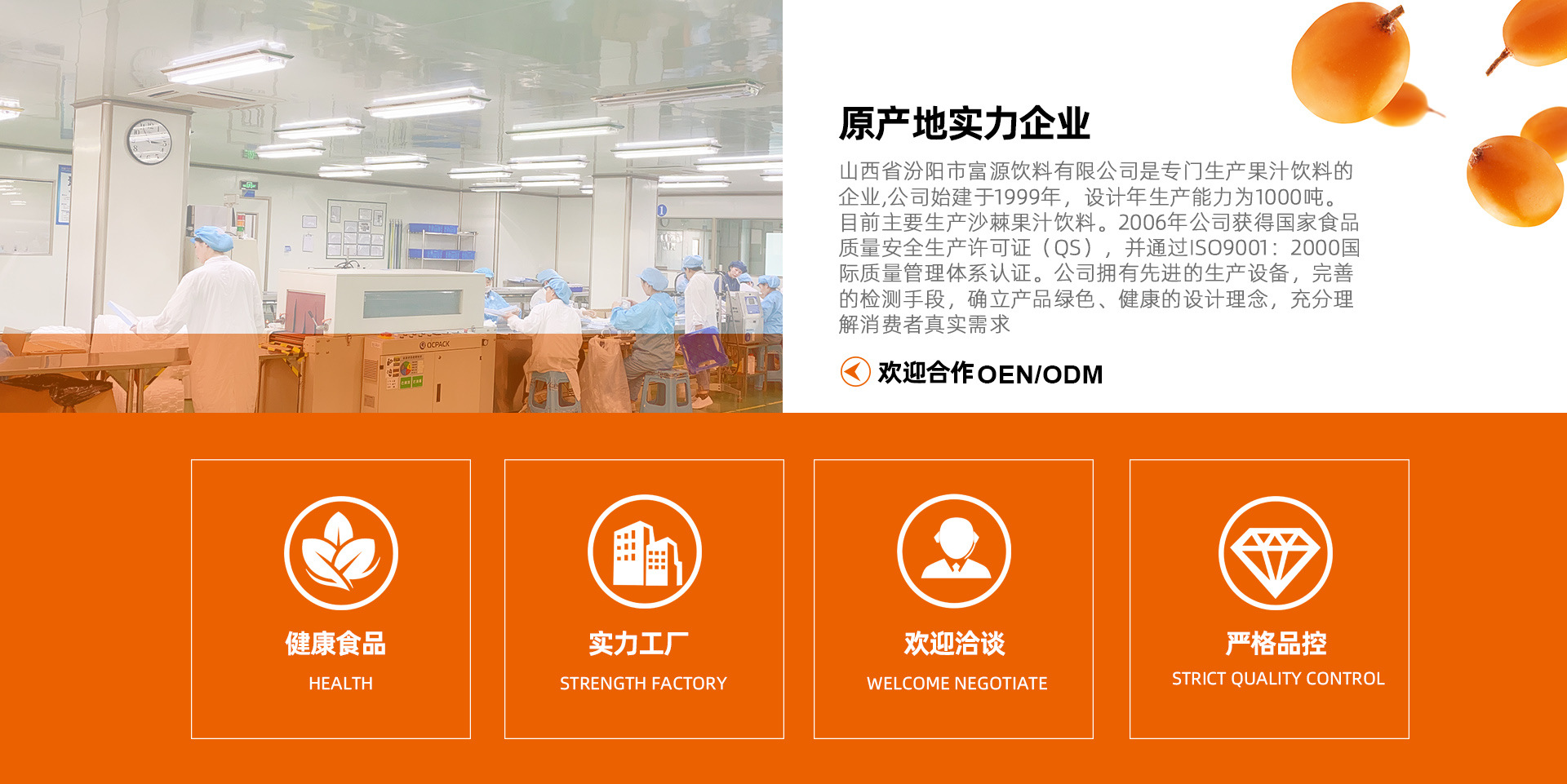 山西省汾陽市富源飲料有限公司是專門生產果汁飲料的企業,公司始建于1999年,設計年生產能力為1000噸。目前主要生產沙棘果汁飲料。2006年公司獲得國家食品質量安全生產許可證(QS),并通過ISO9001:2000國際質量管理體系認證。公司擁有先進的生產設備,完善的檢測手段,確立產品綠色、健康的設計理念,充分理解消費者真實需求,以獨特的工藝技術生產的“世之花”沙棘果汁飲料在市場上享有一定的聲譽,深受消費者的好評,市場占有率逐年提高。隨著市場經濟的發展,公司堅持科學發展觀,不斷加大投資力度,擴大生產技術裝備,引進研發人才,增強科技隊伍建設,運用先進的管理理念和現代化營銷手段,以保持企業可持續性發展。公司秉承“質量即生命,責任重于泰山”的質量觀,遵循“創優、誠信、開拓、敬業”的企業精神,以創優為己任,與時俱進,搞好營銷網絡,品牌的建立和經營,謁誠與各界同仁攜手合作,共創現代生活美好的明天。