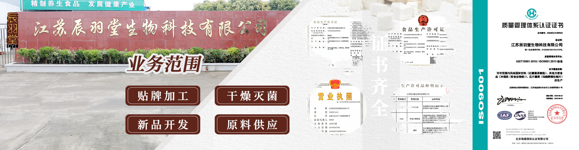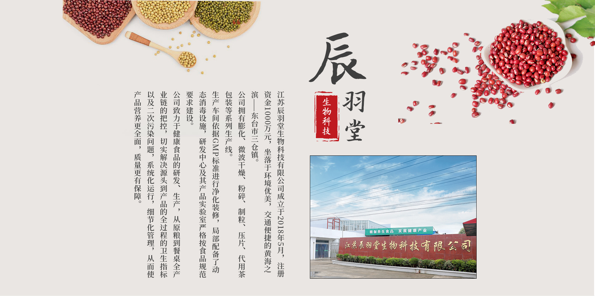 江蘇辰羽堂生物科技有限公司成立于2018年5月,注冊資金1000萬元,坐落于環境優美,交通便捷的黃海之濱——東臺市三倉鎮。 公司擁有膨化、微波干燥、粉碎、制粒、壓片、代用茶包裝等系列生產線。 生產車間依據GMP標準進行凈化裝修,局部配備了動態消毒設施,研發中心及其產品實驗室嚴格按食品規范要求建設。 公司致力于健康食品的研發、生產,從原糧到餐桌全產業鏈的把控,切實解決源頭到產品的全過程的衛生指標以及二次污染問題,系統化運行,細節化管理,從而使產品營養更全面,質量更有保障。 公司努力做好粗糧精制及其深加工工藝研究,依靠江南大學、南京中醫藥大學等高等院校的師資力量,校企緊密合作,助力企業發展,不斷開發新品,適應市場需求,為人類健康作出貢獻。