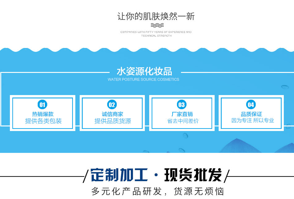 廣州市水姿源化妝品有限公司是一家集化妝品原料、配方研發、加工生產于一體的專業化妝品OEM加工,化妝品ODM加工公司。