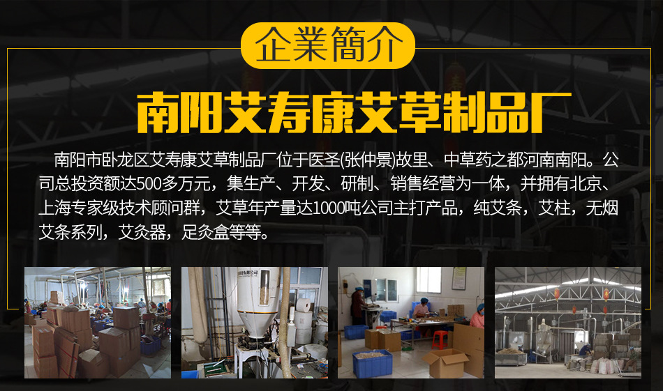 南陽市臥龍區艾壽康艾草制品廠位于醫圣(張仲景)故里、中草藥之都----河南南陽,是經國家正式批準的自主經營,專業從事天然艾草制品加工、銷售、研發于一體的企業。公司自成立以來一直秉承“以人為本,以市場為導向,以技術為立足點,著力于為客戶創造價值”的經營理念,秉承著“傳承千年養生文化”的企業宗旨,專注于高品質艾草加工制作,公司致力發展艾草事業,打造艾草行業精品。立足中國,輻射全球,攜手國內外同行弘揚中醫傳統文化,造福百姓。