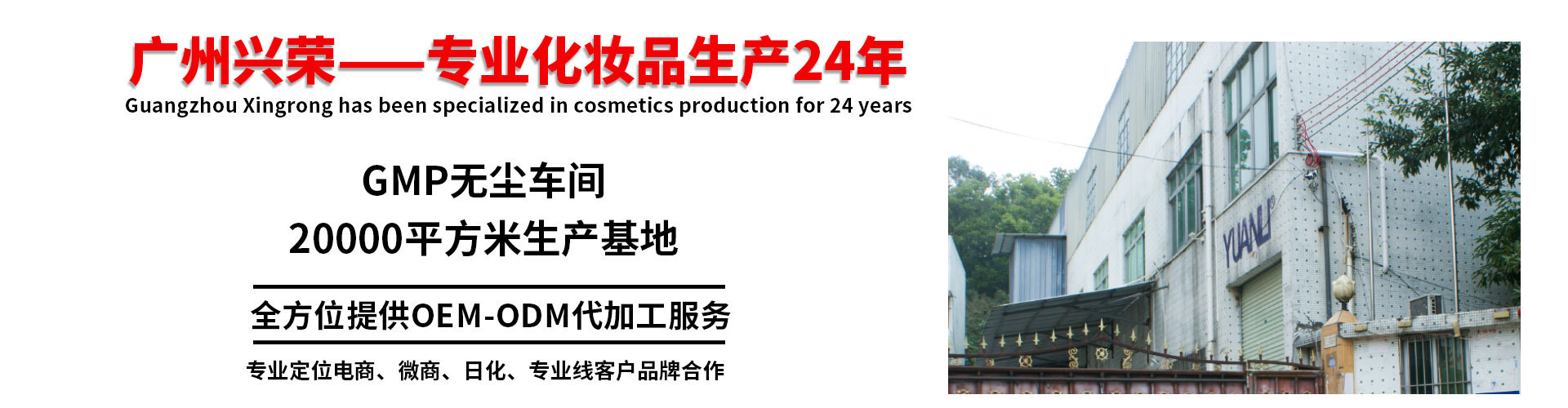 廣州興榮生物科技有限公司是各類個人護理、美發、清潔等產品的專業生產加工公司,擁有完整、科學的質量管理體系。廣州興榮生物科技有限公司的誠信、我們是國內有實力的化妝品企業和產品質量獲得業界的認可。公司自1999年創建至今,目前已擁有兩個通過ISO9000質量認證體系的生產工廠,占地面積8000多平方米,所經營品牌已有30多個,公司目前擁有多條現代化的生產線,多臺/套國際、國內先進乳化、自動灌裝、滅菌、檢驗檢測等儀器,具備各類膏霜、洗護、美容化妝產 歡迎各界朋友蒞臨參觀、指導和業務洽談。