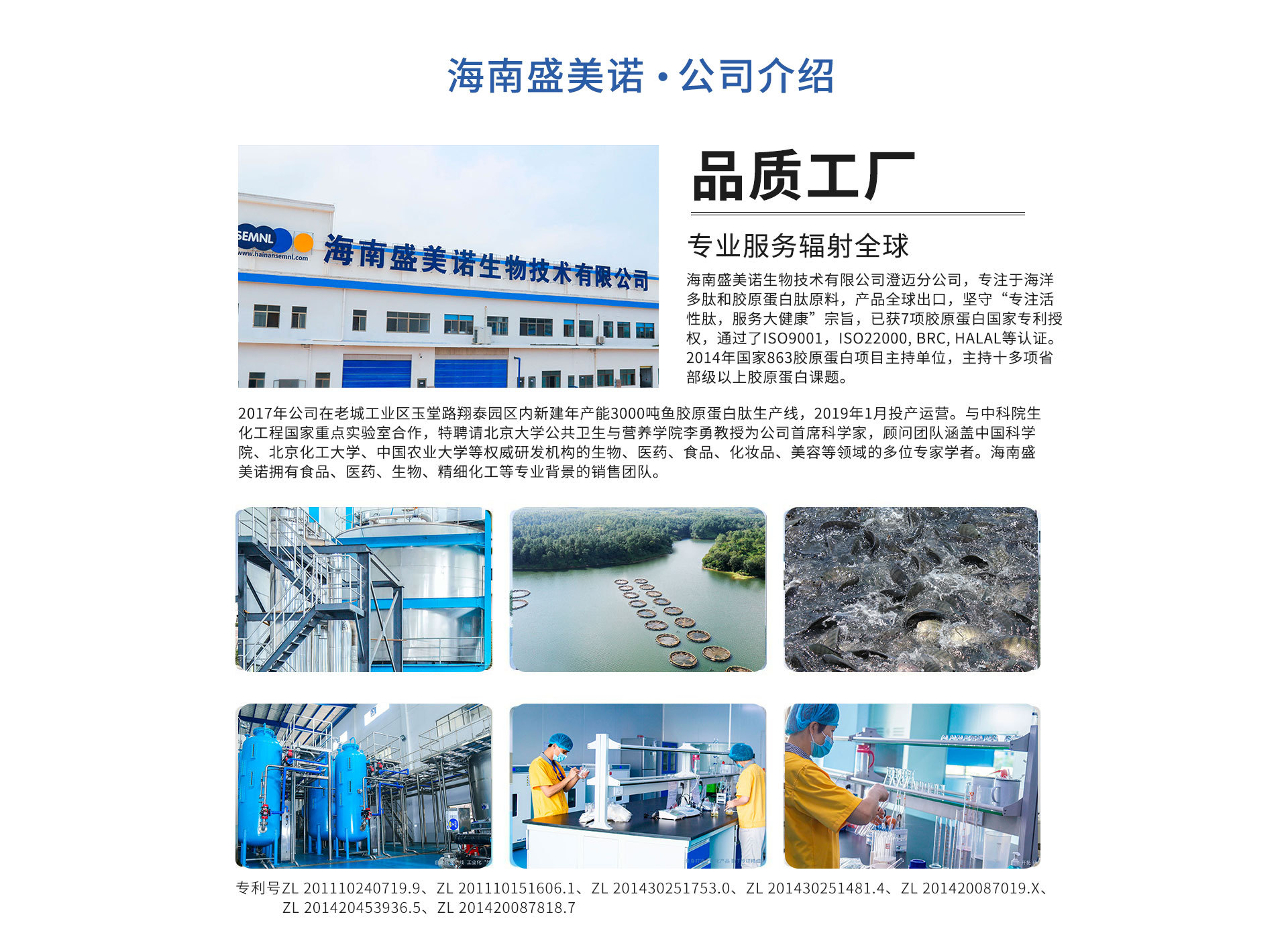 海南盛美諾生物技術有限公司澄邁分公司是專業的膠原蛋白、膠原蛋白肽原料生產商和供應商,擁有完整、科學的質量管理體系。海南盛美諾多年深耕“海洋多肽和膠原蛋白肽”,一直專注于膠原蛋白肽的研發技術和制備工藝,提供綠色天然、健康優質、科學有效的膠原蛋白,致力于打造大健康領域的自有品牌。主營產品:魚膠原蛋白肽、深海鱈魚膠原蛋白肽、彈性蛋白肽、非變性II型膠原蛋白、水解II型膠原蛋白、牡蠣肽、牛膠原蛋白肽。