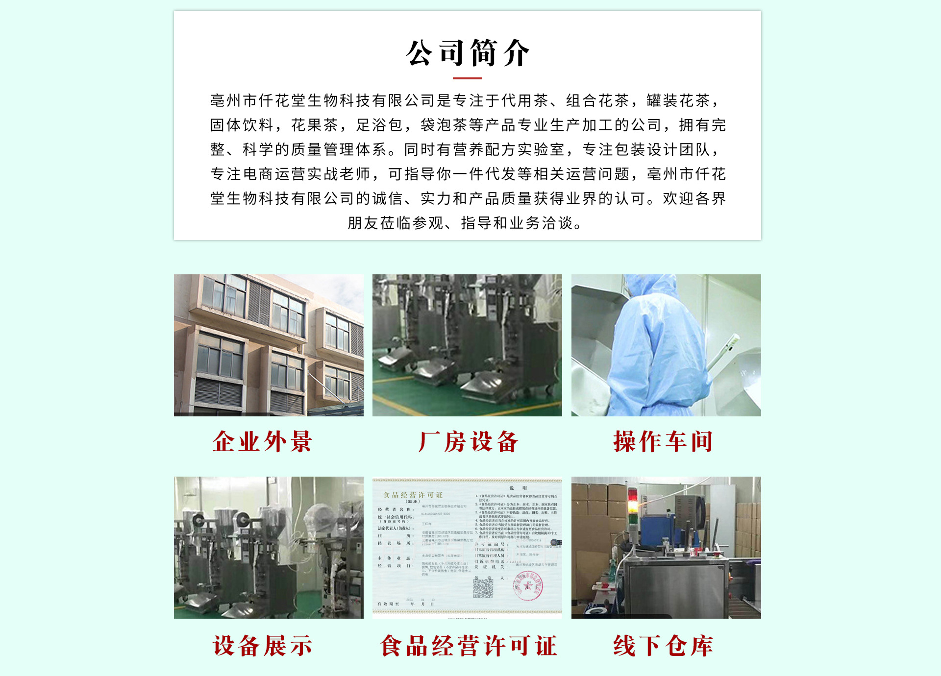 安徽仟花堂生物科技有限公司是專注于代用茶,組合花茶,罐裝花茶,三角包,固體飲料,足浴包,袋泡茶等產品專業生產加工的公司,擁有完整,科學的質量管理體系。同時有營養配方的實驗室,專注包裝設計團隊,專注電商運營實戰老師,可指導你一件代發等相關運營問題,安徽茗方花源生物科技有限公司的誠信,實力和產品質量獲得業界的認可。歡迎各界朋友蒞臨參觀,指導和業務洽談。