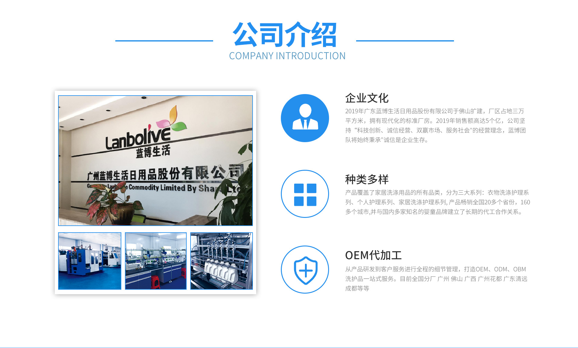 2019年廣東藍博生活日用品股份有限公司于佛山擴建,廠區(qū)占地三萬平方米,擁有現(xiàn)代化的標準廠房。采用全自動化流水線,引進先進的管理理念,18條專線同時滿足日產(chǎn)36萬瓶產(chǎn)能。2019年銷售額高達5個億 公司目前分別成立終端、oem代工事業(yè)部、線上事業(yè)部等;產(chǎn)品覆蓋了家居洗滌用品的所有品類,分為三大系列:衣物洗滌護理系列、個人護理系列、家居洗滌護理系列,從產(chǎn)品研發(fā)到客戶服務(wù)進行全程的細節(jié)管理,打造oem、odm、obm洗護品一站式服務(wù)。 產(chǎn)品暢銷全國20多個省份,160多個城市,進駐了大型連鎖超市家樂福、樂購和國內(nèi)蘇果超市、步步高,人人樂等,并與國內(nèi)多家知名的嬰童品牌建立了長期的代工合作關(guān)系,贏得了廣大消費者和廠家的認可和信賴。 公司堅持“科技創(chuàng)新、誠信經(jīng)營、雙嬴市場、服務(wù)社會"的經(jīng)營理念,藍博團隊將始終秉承"誠信是企業(yè)生存目前全國分廠廣州佛山廣西廣州花都廣東清遠成都等等。