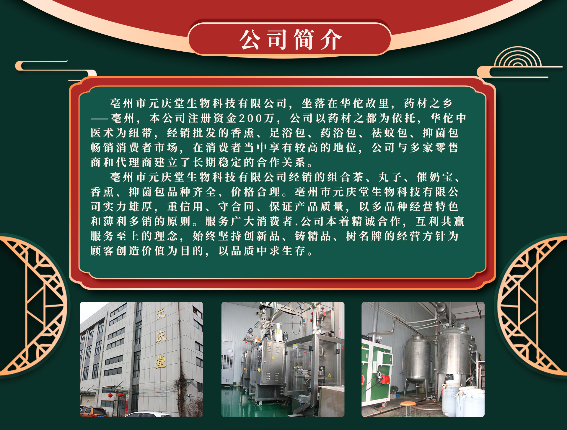 亳州市元慶堂生物科技有限公司,坐落在華佗故里,藥材之鄉——亳州,本公司注冊資金200萬,公司以藥材之都為依托,華佗中醫術為紐帶,經銷批發的香熏、足浴包、藥浴包、祛蚊包、抑菌包暢銷消費者市場,在消費者當中享有較高的地位,公司與多家零售商和代理商建立了長期穩定的合作關系。亳州市元慶堂生物科技有限公司經銷的香熏、足浴包、藥浴包、祛蚊包、抑菌包品種齊全、價格合理。亳州市元慶堂生物科技有限公司實力雄厚,重信用、守合同、保證產品質量,以多品種經營特色和薄利多銷的原則。服務廣大消費者.公司本著精誠合作,互利共贏,服務至上的理念,始終堅持創新品、鑄精品、樹名牌的經營方針,為顧客創造價值為目的,以品質中求生存,為顧客打造健康、綠色、養生保健產品!歡迎關注養生的各界人士前來洽談。