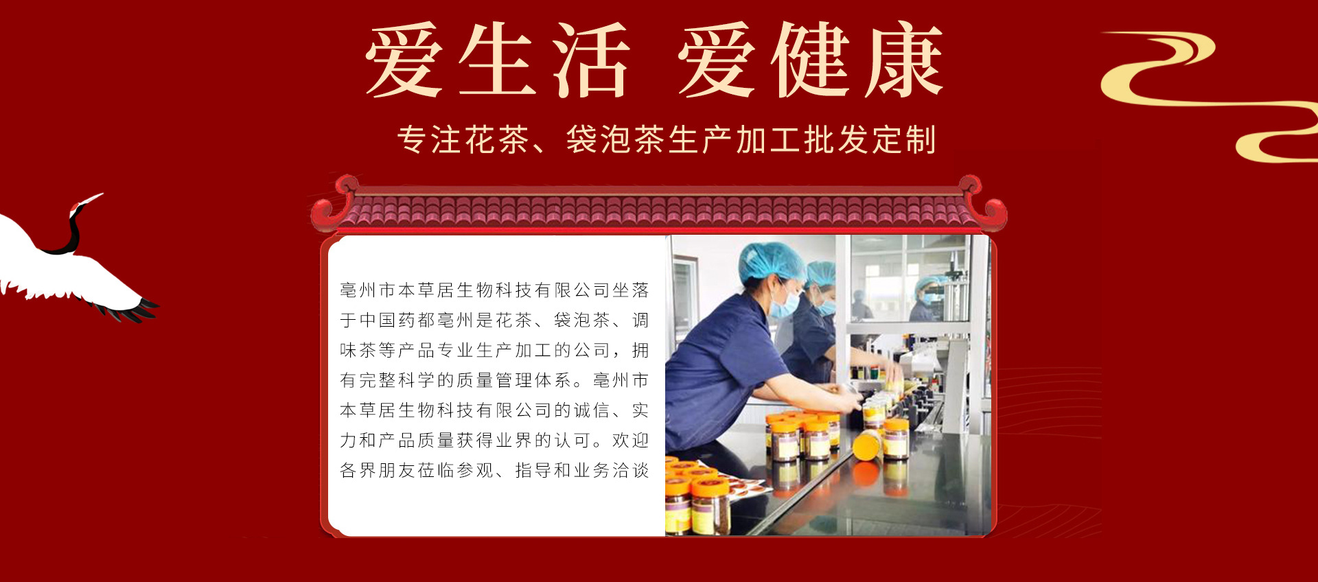 亳州市本草居生物科技有限公司 坐落于藥都之鄉.華佗故里,安徽省亳州市文采路800號,公司起源于2006年,新廠成立于2018年注冊資金1000萬元整,公司占地5800平方米,總建筑面積4600平方米,公司員工220人,其中生產團隊160人,研發團隊5人,銷售團隊20人,后勤物資采購25人。 亳州市本草居生物科技有限公司是專業從事健康養生花茶,調味茶,固體飲料,壓片糖果,方便食品,固態調味研發生產銷售。致力于養生理念發掘并應用各種純天然草本健康養生資源。期待與您合作,攜手共創輝煌。 我公司以質量求生存,以誠信求發展,在全面的質量控制下使產品質量得到更有效的保障,合理的價格優質的產品,良好的服務,是我們對客戶的承諾,歡迎各界朋友蒞臨參觀,指導和業務洽談