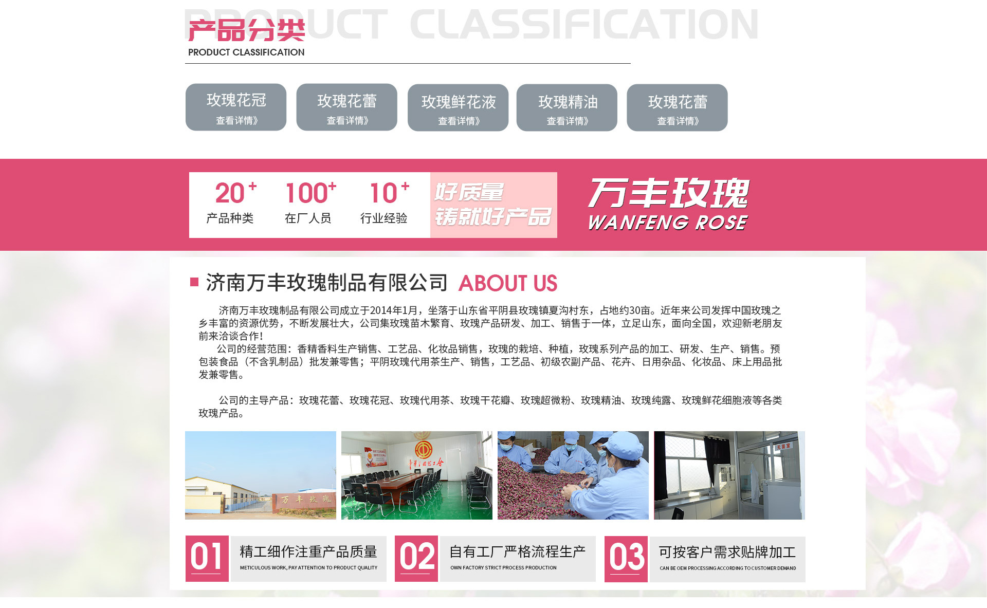 濟南萬豐玫瑰制品有限公司,玫瑰特產(chǎn)加工銷售:玫瑰花瓣、玫瑰花冠、玫瑰花蕾、玫瑰精油、玫瑰純露、玫瑰產(chǎn)品代加工等。品種齊全 、資質(zhì)齊全、讓客戶滿意是我們的宗旨!